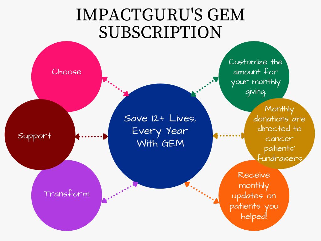 In order for cancer patients to get faster and more consistent help, ImpactGuru has started a new initiative that is bigger, better and bolder than ever before. This initiative is a subscription called GEM or ‘Give Every Month’ that helps changemakers and donors, donate monthly to cancer patients. GEM directs all monthly donations to new and most critical cancer patients every month.