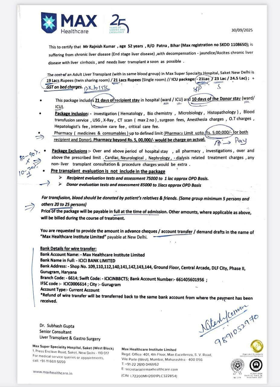 My name is Ritika Kumari, and I am raising funds for my beloved father, Rajnish Kumar, who is battling a life-threatening liver condition. Doctors at Max Super Speciality Hospital, Saket have advised an urgent liver transplant — his only hope for survival. We are doing everything possible, but we are now in desperate need of financial support to continue his treatment.