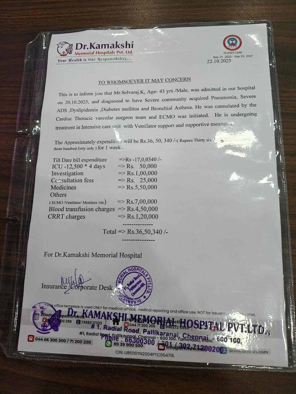 ECMO செல்வராஜுக்கு உயிர்வாழ வாய்ப்பளிக்கும் அதே வேளையில், இந்த சிகிச்சை மிகப்பெரிய செலவுகளுடன் வருகிறது. ஆரம்ப அமைப்புக்கு சுமார் ₹5 லட்சம் செலவாகும், மேலும் தினசரி பராமரிப்பு செலவுகள் ₹3-4 லட்சம் வரை இருக்கும். இந்த தீவிர சிகிச்சையின் நான்காவது நாளில் நாங்கள் இப்போது இருக்கிறோம், மொத்த செலவு தோராயமாக ₹35,00,000 ஐ எட்டும் என்று எதிர்பார்க்கப்படுகிறது - இது எங்கள் குடும்பத்தால் தாங்க முடியாத அளவுக்கு அதிகமாகும்.