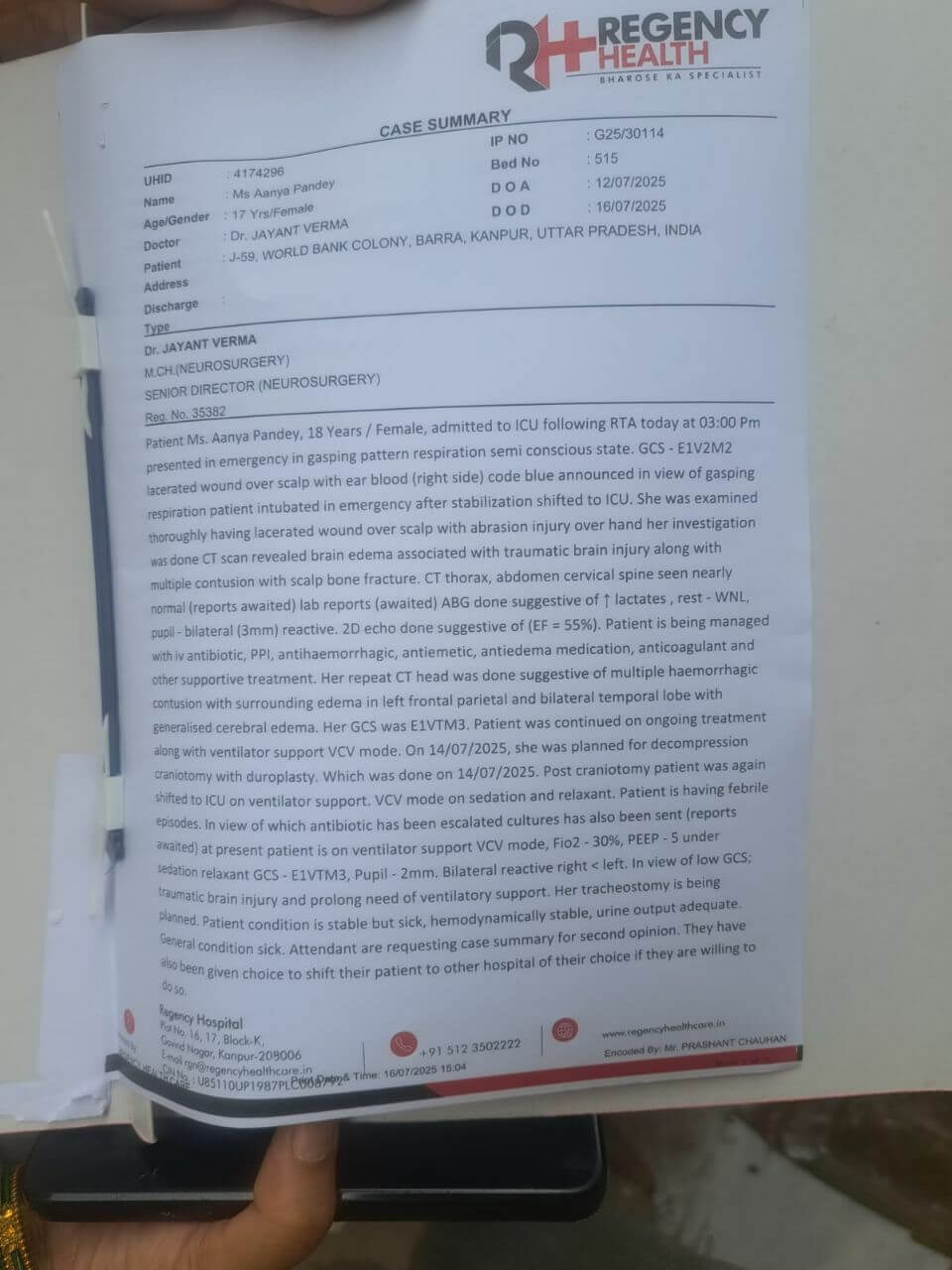 My name is Sanjay Pandey, and I am raising urgent funds for my daughter, Aanya Pandey, who is fighting for her life after a serious road accident.