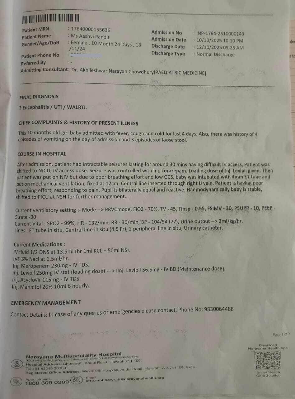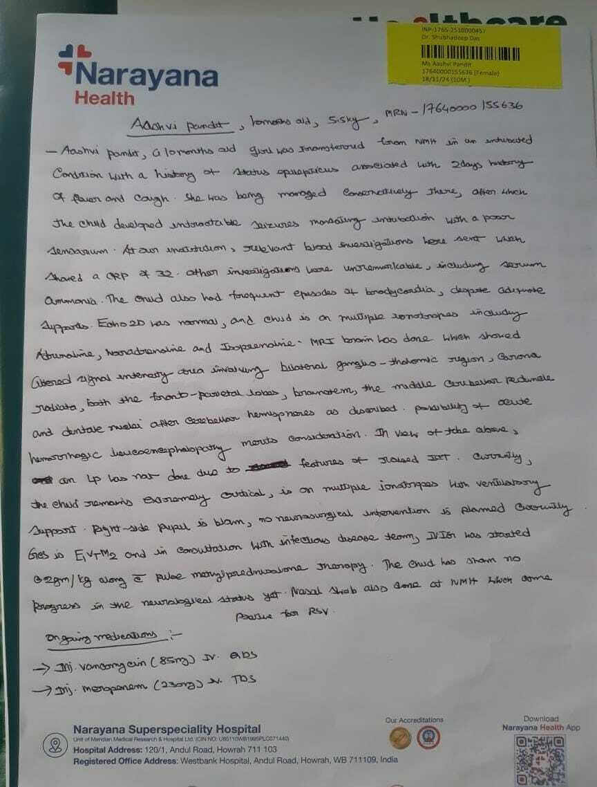 My name is Milan Pandit, and I am reaching out with a heart full of worry and hope for my 10-month-old daughter, Aashvi Pandit, who is battling Encephalitis. She is currently undergoing intensive treatment at Narayana Hospital, Howrah.