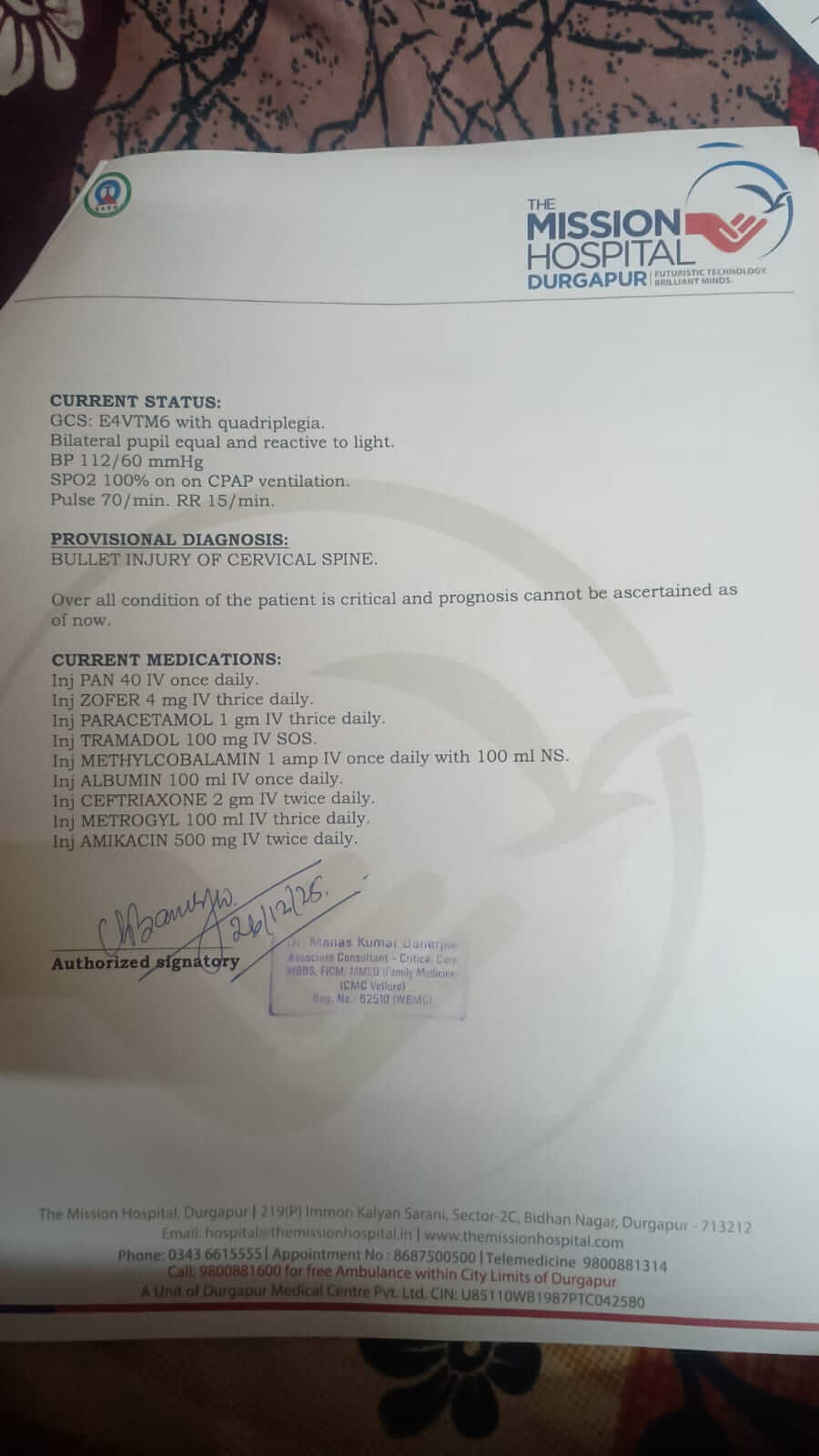 The financial burden of spinal injury treatment is overwhelming. Specialized surgeries, intensive care, medications, and long-term rehabilitation come at an enormous cost. While we have done everything possible to arrange funds, the remaining ₹50,00,000 is far beyond what our family can manage alone.