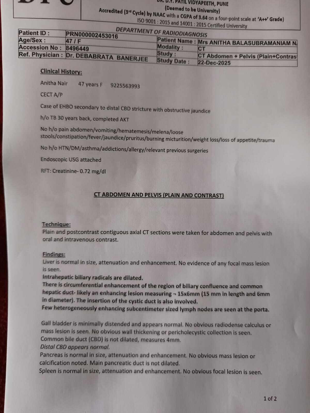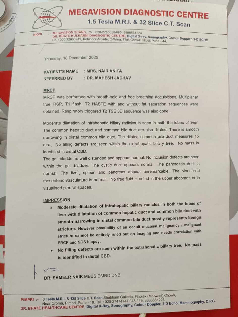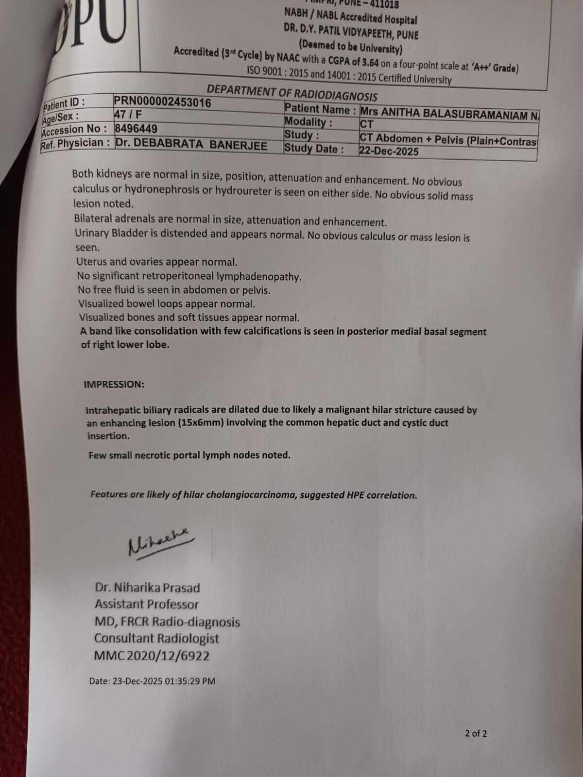 As per the report from Dr D. Y. Patil Medical College, Hospital & Research Centre, Pune, Anitha is suspected to have Hilar Cholangiocarcinoma, a rare and aggressive cancer affecting the bile ducts near the liver. What began as subtle discomfort soon turned into alarming symptoms like yellowing of the eyes, relentless itching, extreme fatigue, and rapid weight loss. Each passing day became harder, not just physically, but emotionally.