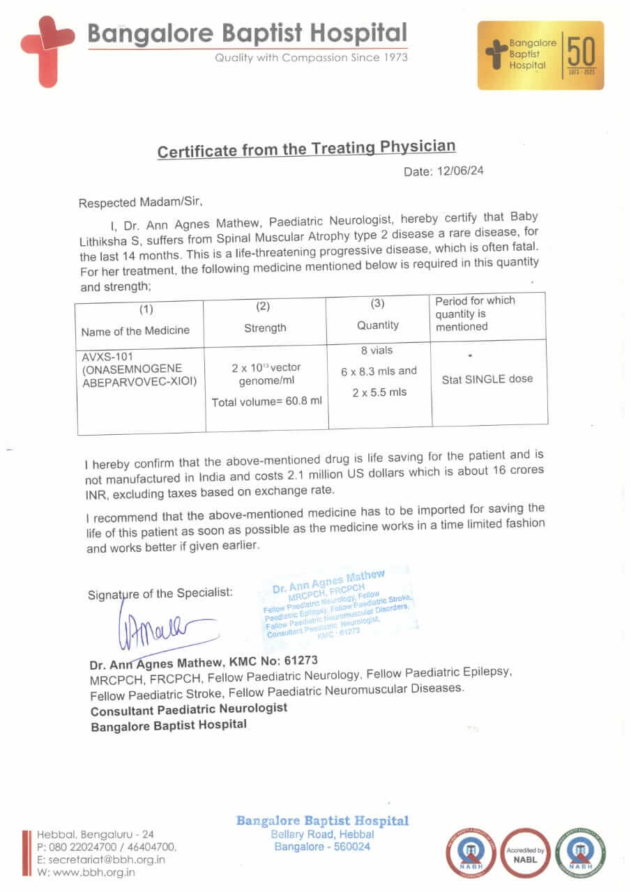 இதற்கு நேர்மாறாக, இந்த மைல்கற்களின் மேற்பரப்பைக் கீறிவிடக்கூட லிதிக்ஷா போராடுகிறார். கவலையுடன், நாங்கள் நேராக பெங்களூருவில் உள்ள பாப்டிஸ்ட் மருத்துவமனைக்குச் சென்றோம், அங்கு லிதிக்ஷாவுக்கு ஸ்பைனல் மஸ்குலர் அட்ராபி (SMA) எனப்படும் மரபணு நரம்புத்தசைக் கோளாறு இருப்பது கண்டறியப்பட்டது.