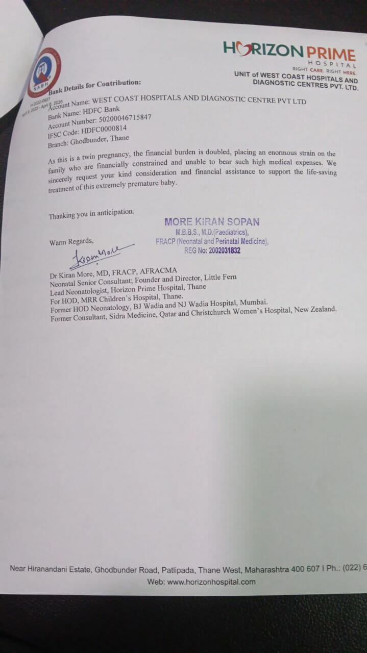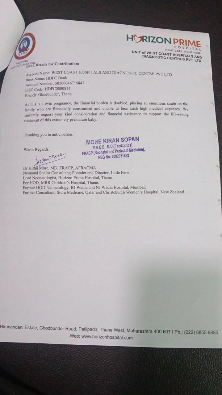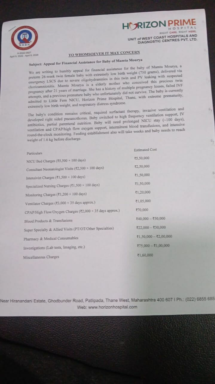 My name is Mamta Mourya, and I am reaching out as a mother in deep distress. My newborn twin babies are fighting for their lives in the NICU at Horizon Prime Hospital, Thane.