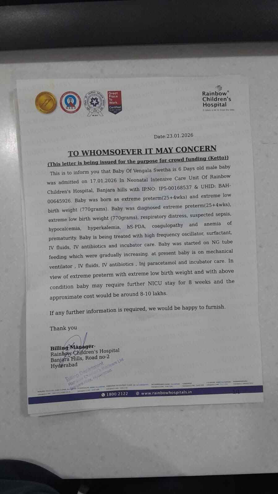 ఏదైనా చిన్న సహాయం కూడా నేరుగా NICU కేర్, మందులు, పరిశీలన మరియు ప్రాణాపాయక చికిత్సల కోసం ఉపయోగపడుతుంది. మీరు డొనేట్ చేయలేరా? కనీసం ఈ విజ్ఞప్తిని షేర్ చేయడం ద్వారా ఎవరో ఈ పరిస్థితిని మార్చగల వ్యక్తికి చేరవేయవచ్చు.