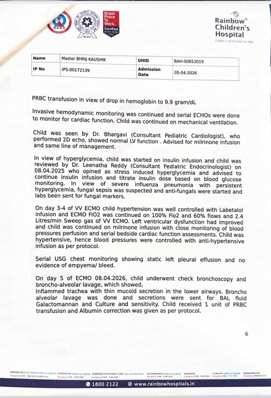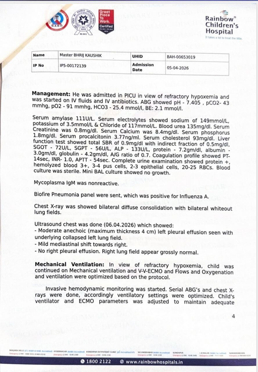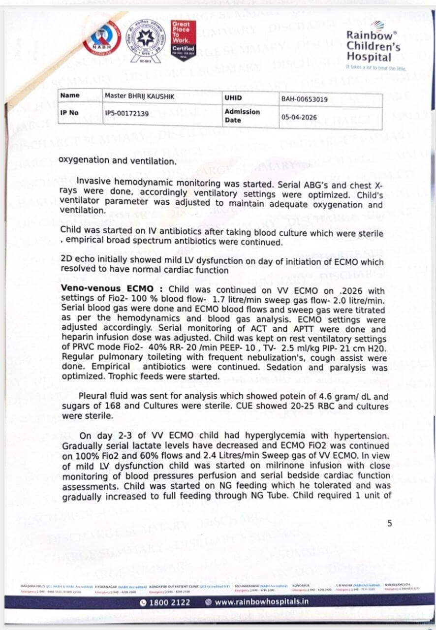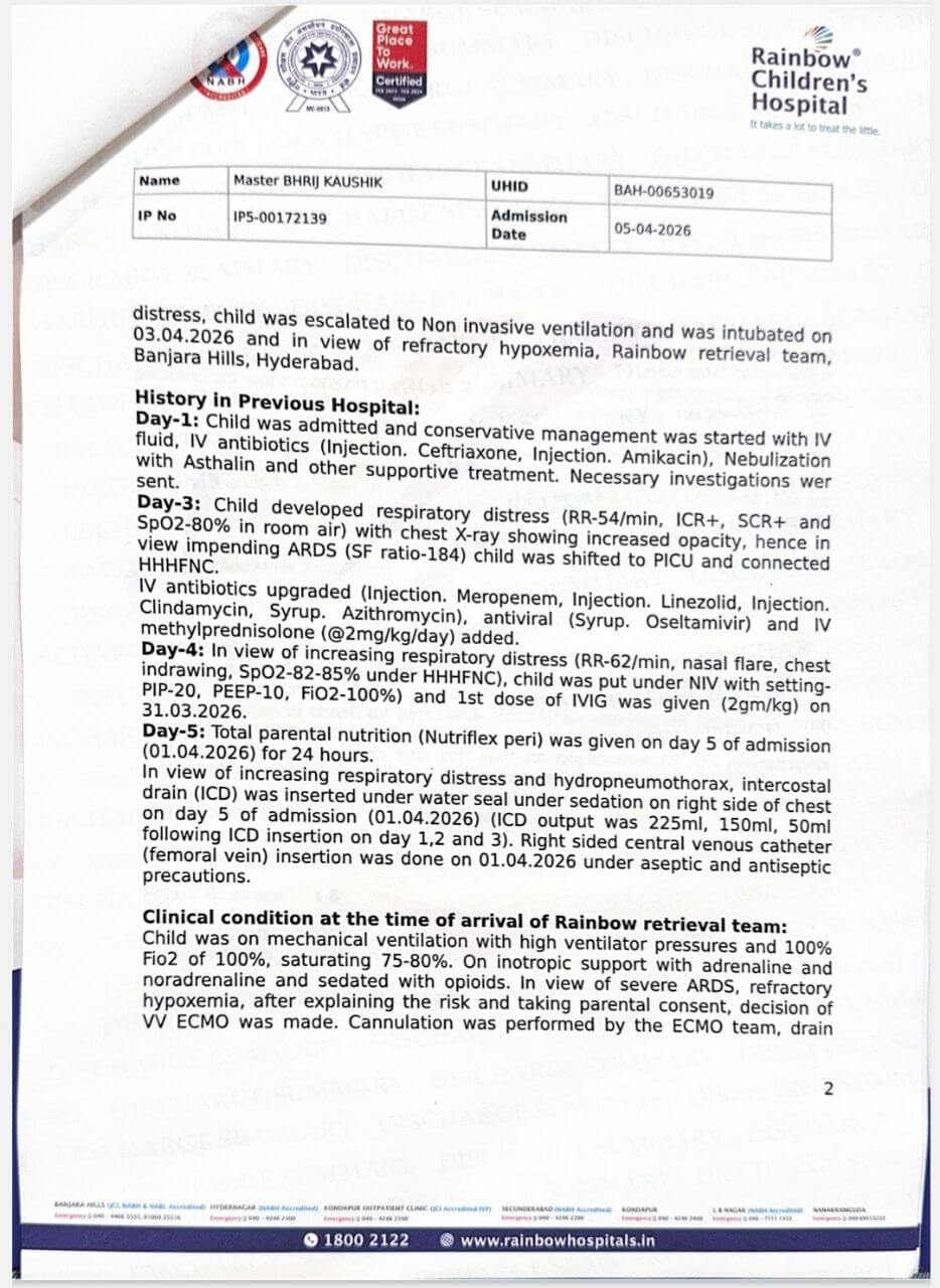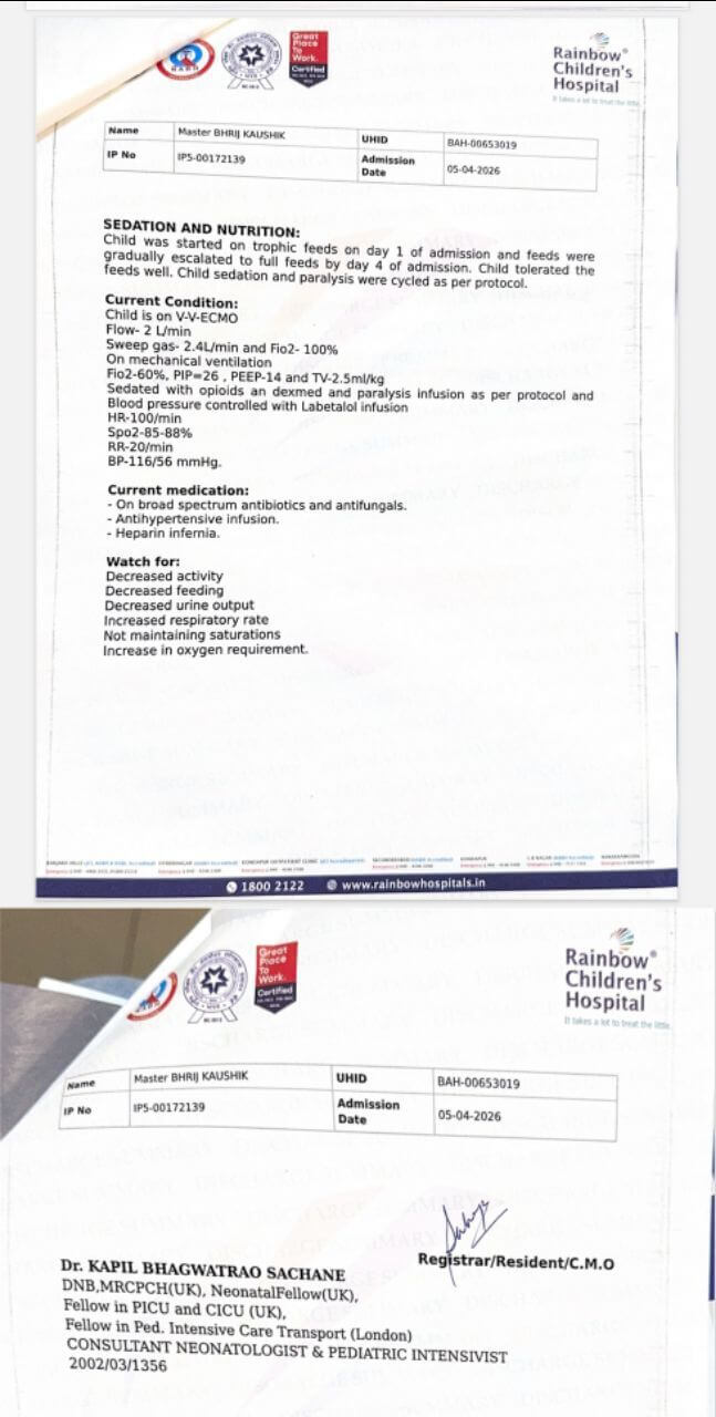We are Kaushik Kumar Neog and Dr Adrija Deka, and we are reaching out to you from a place of absolute desperation and flickering hope. Our 8-year-old son, Bhrij Kaushik, is currently suspended between life and death at Rainbow Children’s Hospital, Hyderabad. What began as a case of Influenza A pneumonia rapidly spiralled into Acute Respiratory Distress Syndrome (ARDS), causing his little lungs to fail. When ventilators were no longer enough to keep him alive, we had to make the harrowing decision to transport him via air ambulance from Guwahati to Hyderabad for ECMO—the highest form of life support available. Watching your child being flown across the country in a race against time is a trauma no parent should ever endure.