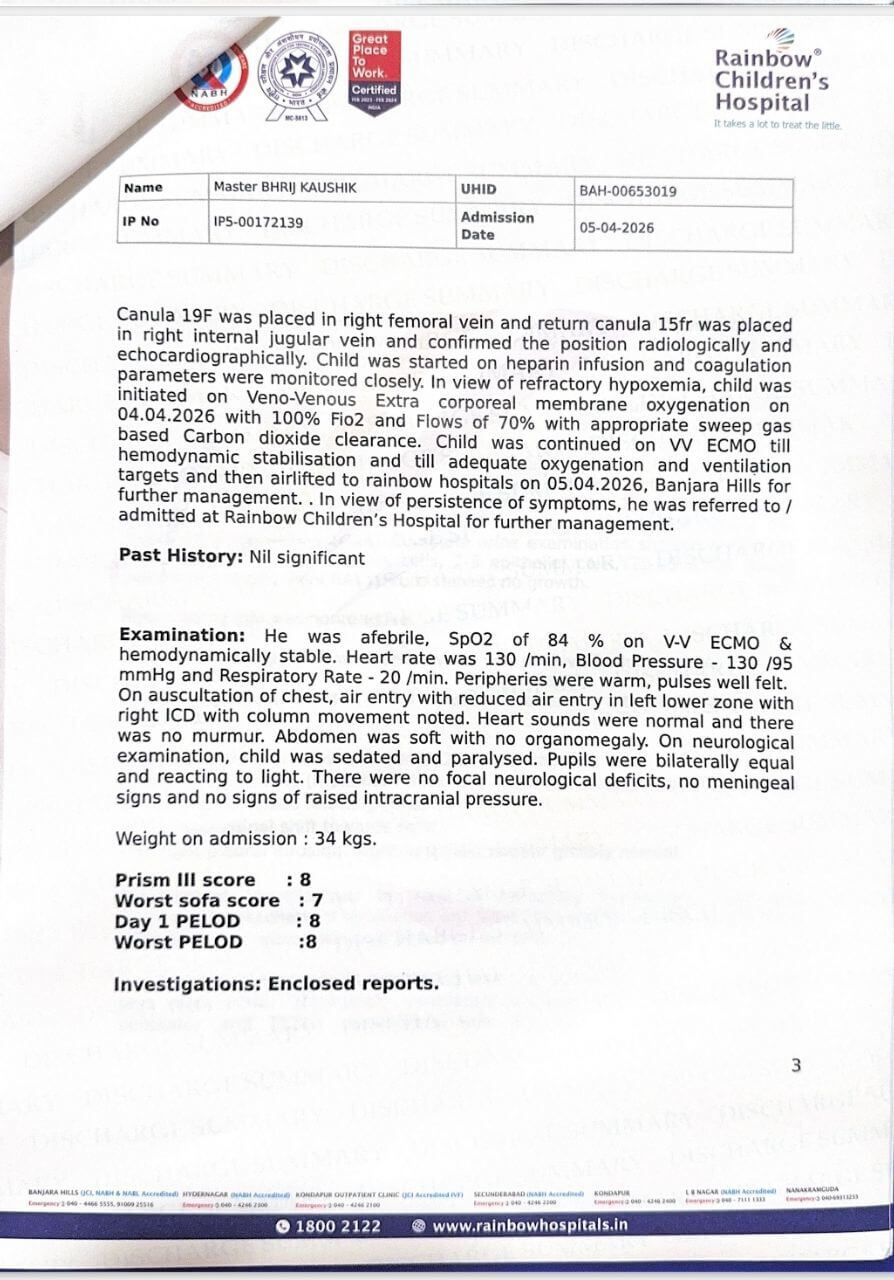 Right now, an ECMO machine is doing the work that Bhrij’s lungs can no longer do, providing him the precious time his body needs to heal. He is in critical condition, fighting with every ounce of his 8-year-old strength. However, the cost of maintaining a child on ECMO, coupled with the intensive care, specialised medications, and the enormous expense of the air ambulance, has reached a staggering ₹50,00,000. As parents, we want nothing more than to focus entirely on our son’s recovery, but the crushing weight of this financial burden is a constant, suffocating shadow. We are a family pushed to our absolute limit, and we simply cannot afford this life-saving intervention alone.