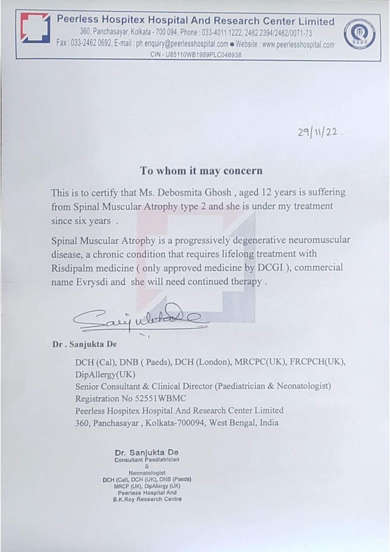 We are trying to raise funds to continue treating Debosmita with Risdipalm. Your contribution will help save her life, please open your heart, and donate. A follow and a share on social media will help us reach out and spread Debosmita’s story.