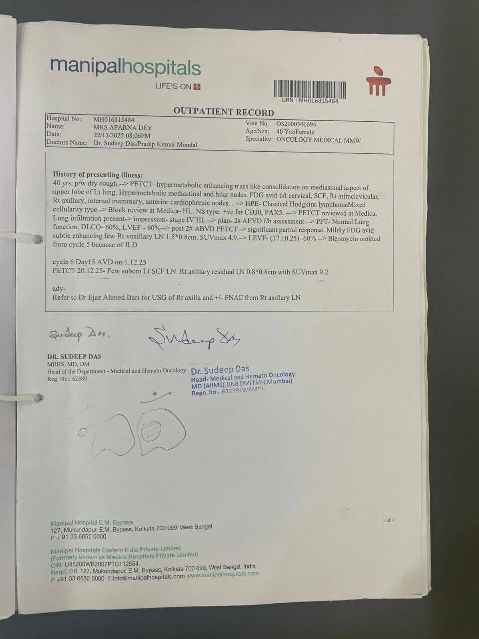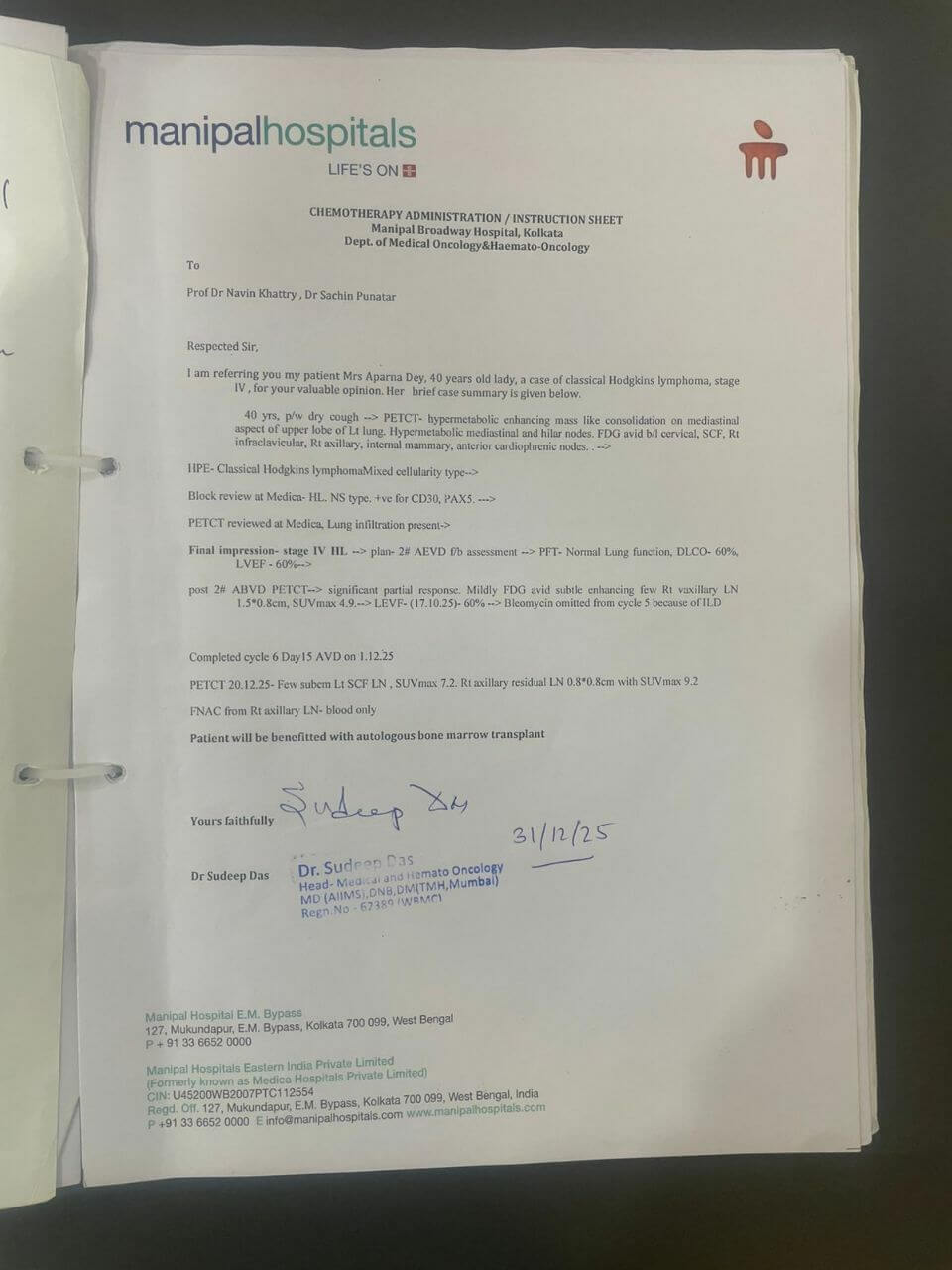 My wife, Aparna, is not just a teacher by profession, she is someone who has quietly shaped so many young lives with patience and kindness. In 2025, our lives changed overnight when she was diagnosed with Hodgkin lymphoma. Since then, it has been a long and exhausting journey of hospital visits, uncertainty, and watching her go through chemotherapy. She has completed 12 cycles, and even now, with 2 more cycles left, the fight is not over.