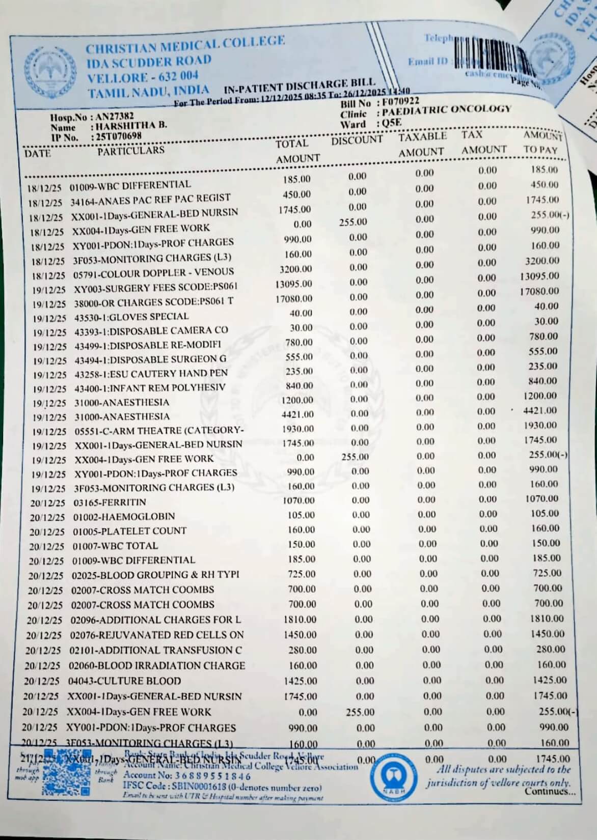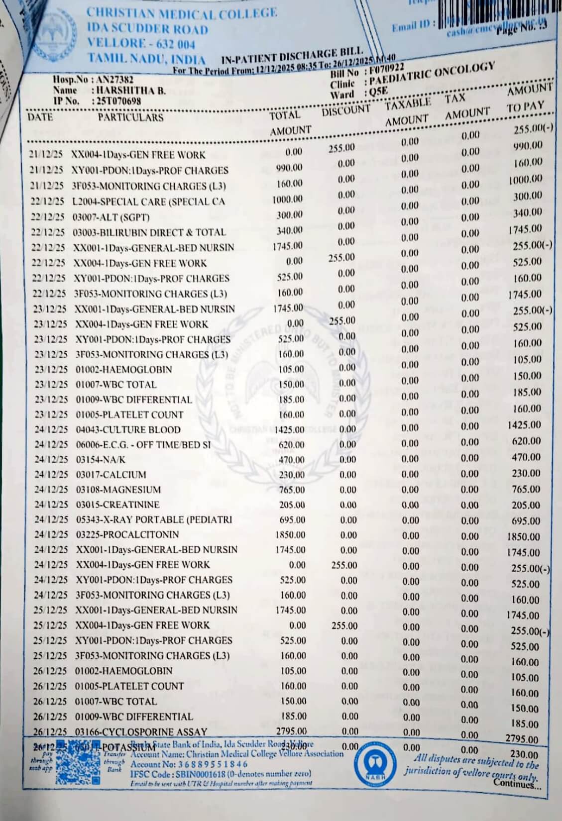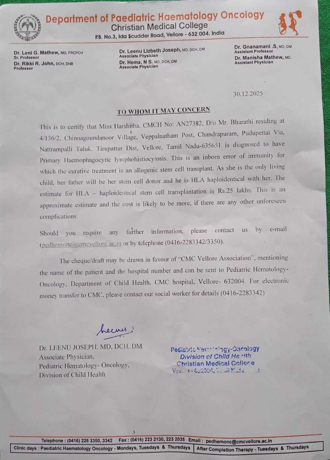 Harshita is currently receiving treatment at Christian Medical College and Hospital, Ranipet Campus – Vellore, a trusted and well-known medical institution. The doctors are doing their best, but the treatment is long, complex, and extremely expensive.