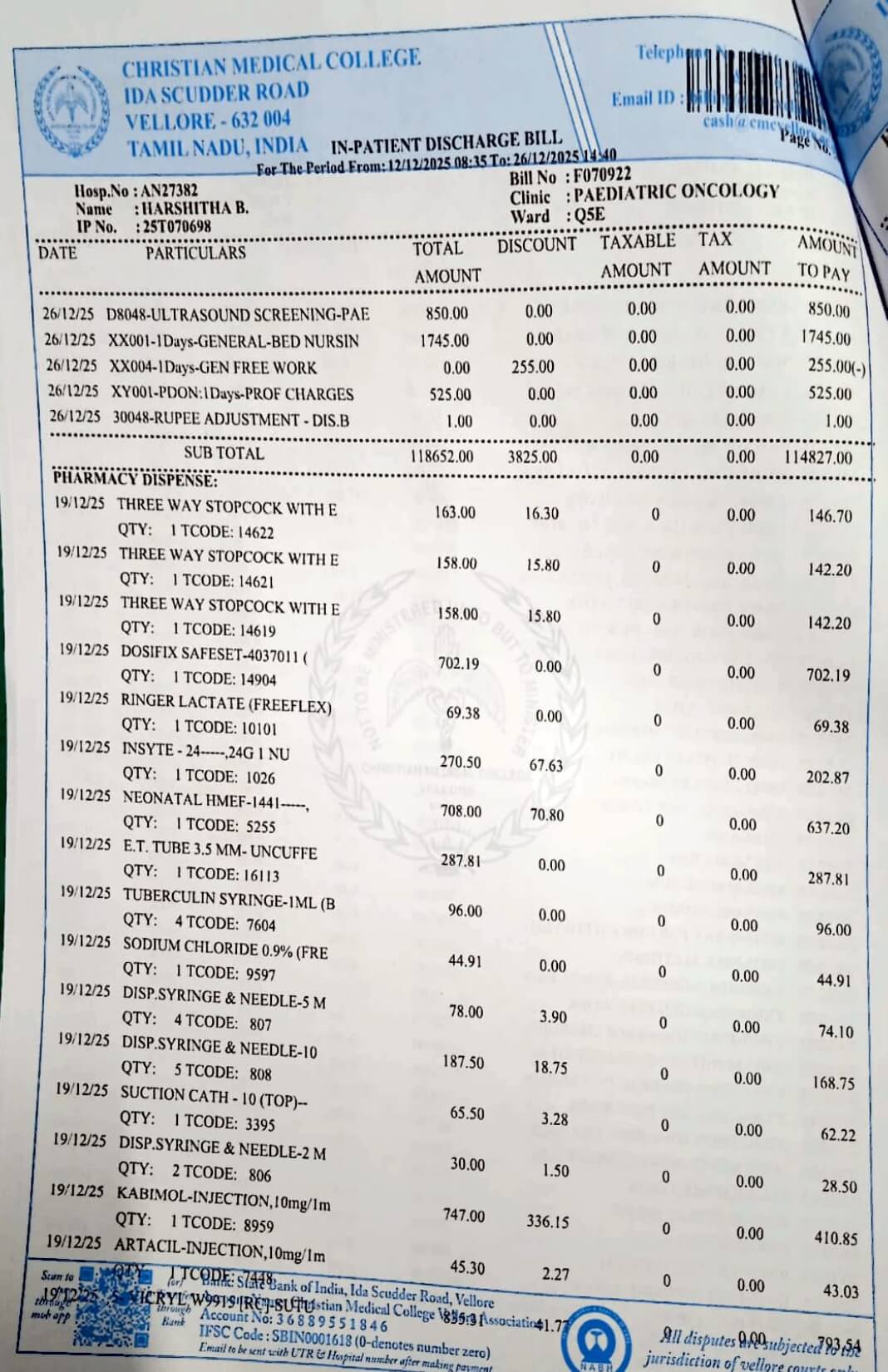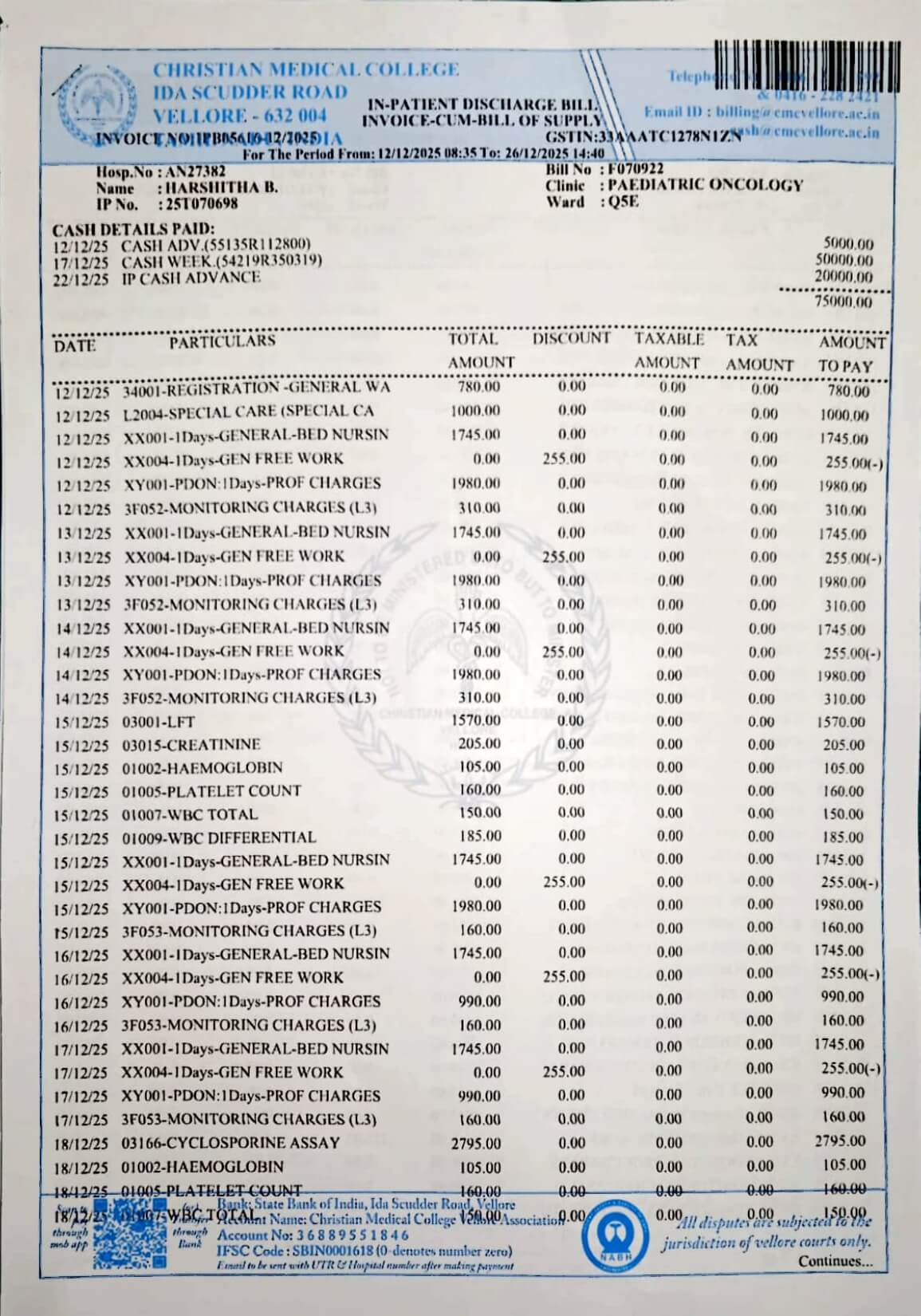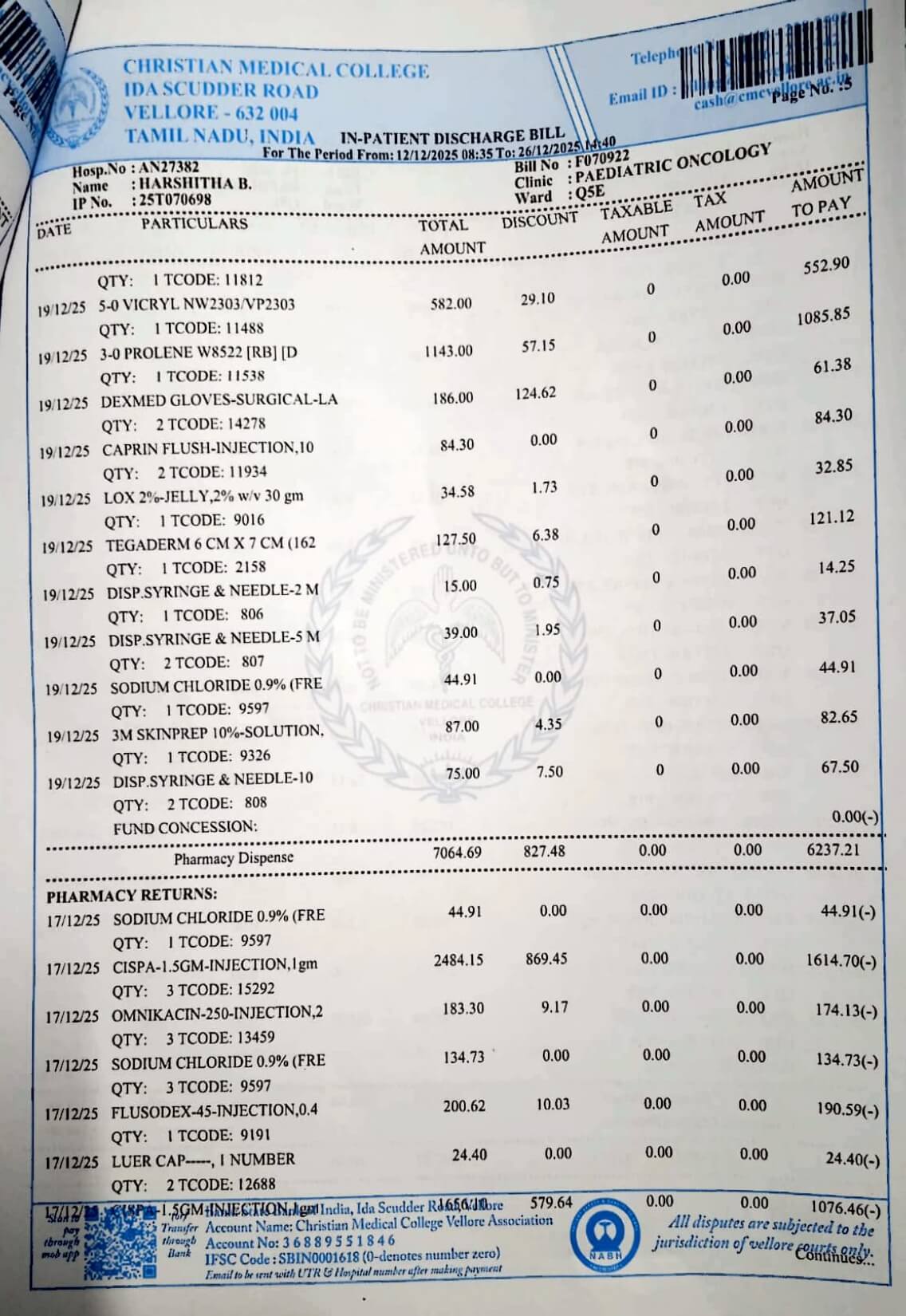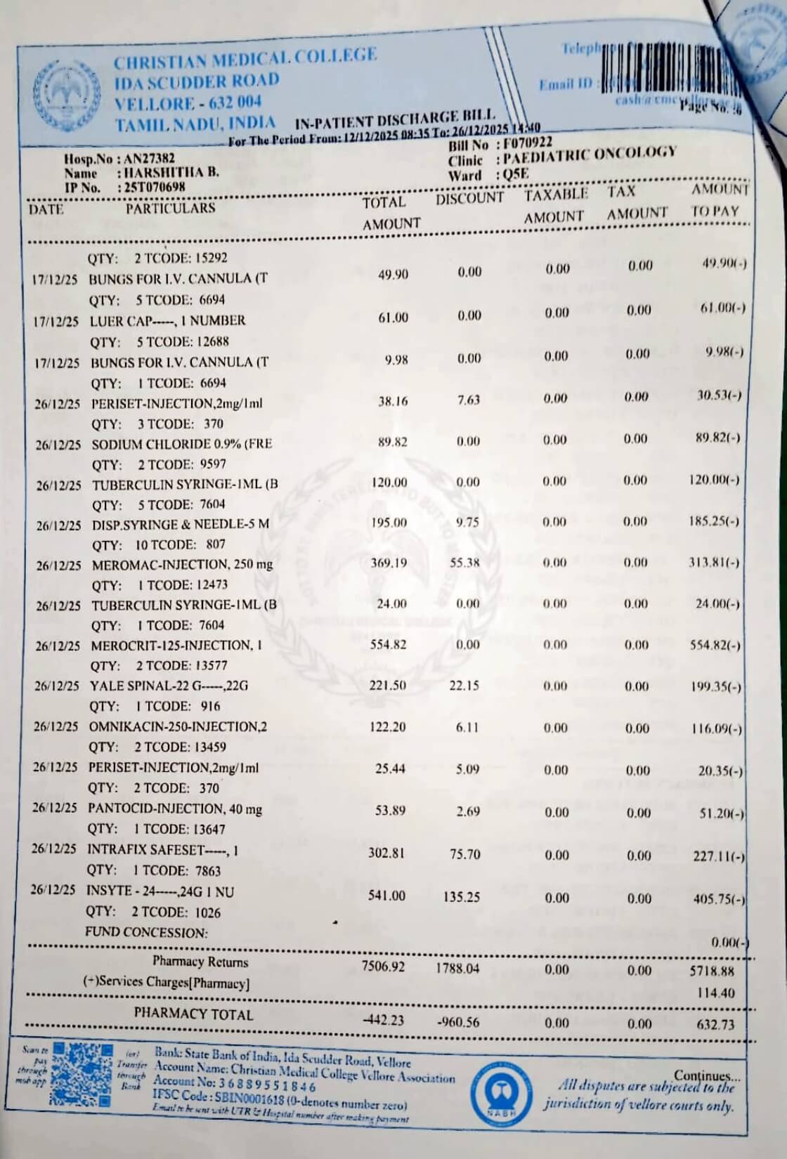 Harshita is currently receiving treatment at Christian Medical College and Hospital, Ranipet Campus – Vellore, a trusted and well-known medical institution. The doctors are doing their best, but the treatment is long, complex, and extremely expensive.