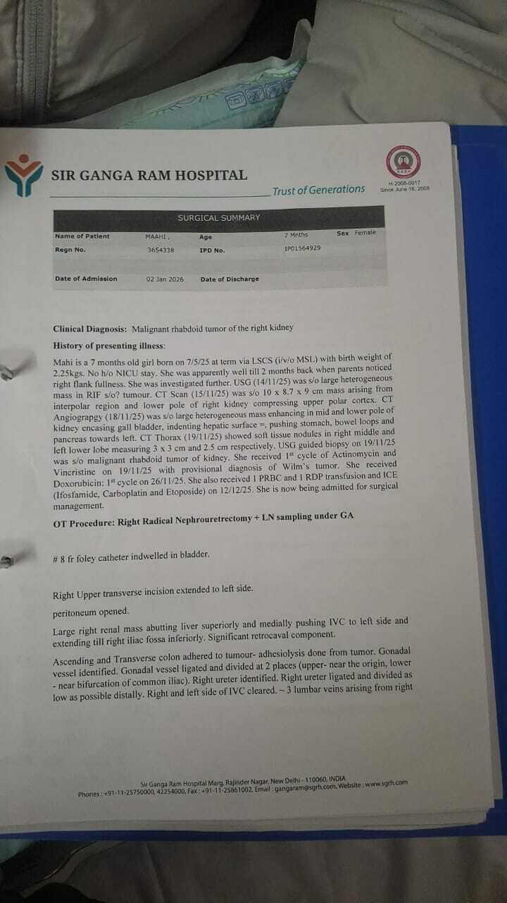 Maahi has been diagnosed with Malignant Rhabdoid Tumour of the right kidney. This is a rare, highly aggressive childhood cancer, typically diagnosed in young children. It is characterised by rapid growth, early metastasis, and a poor prognosis, often linked to genetic changes in the SMARCB1/INI1 gene.