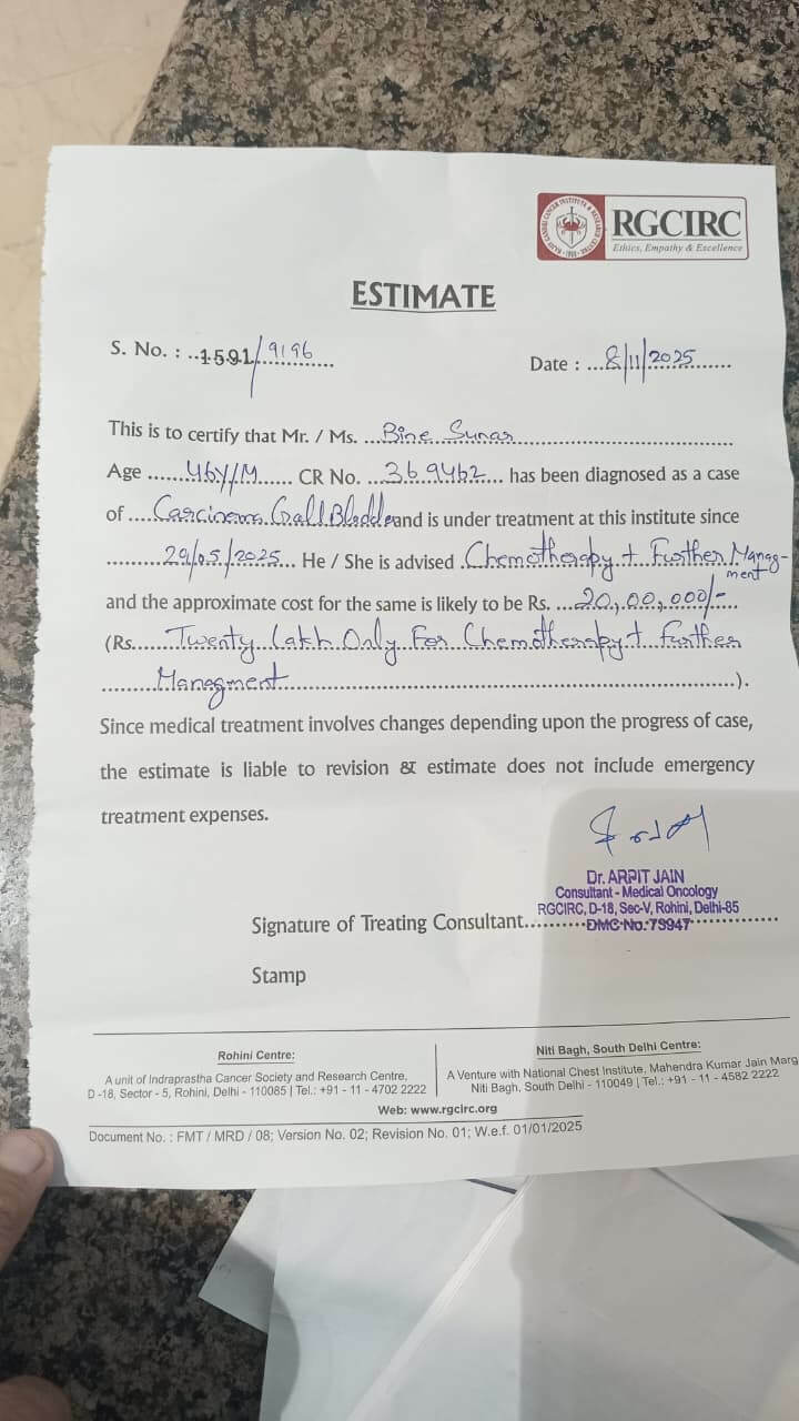 My name is Mahendra Sunar, and I am reaching out with a humble request for your support. My father, Bine Sunar, has been battling metastatic gallbladder cancer — a severe and painful condition where cancer has spread from the gallbladder to other parts of the body such as the liver, lungs, and bones.