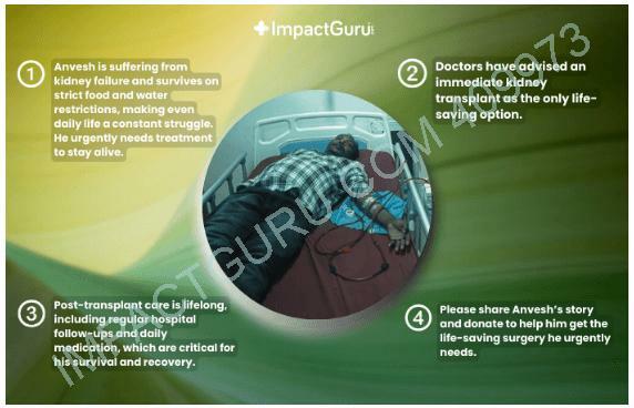 Anvesh is in urgent need of a kidney transplant, followed by lifelong medication and care, which costs lakhs. My family and I have done everything in our power, but with the rising medical bills for his treatment, we find ourselves in a dire situation.
