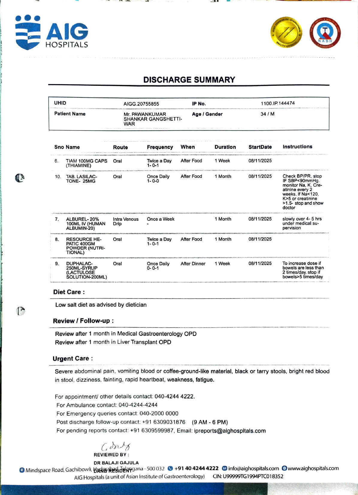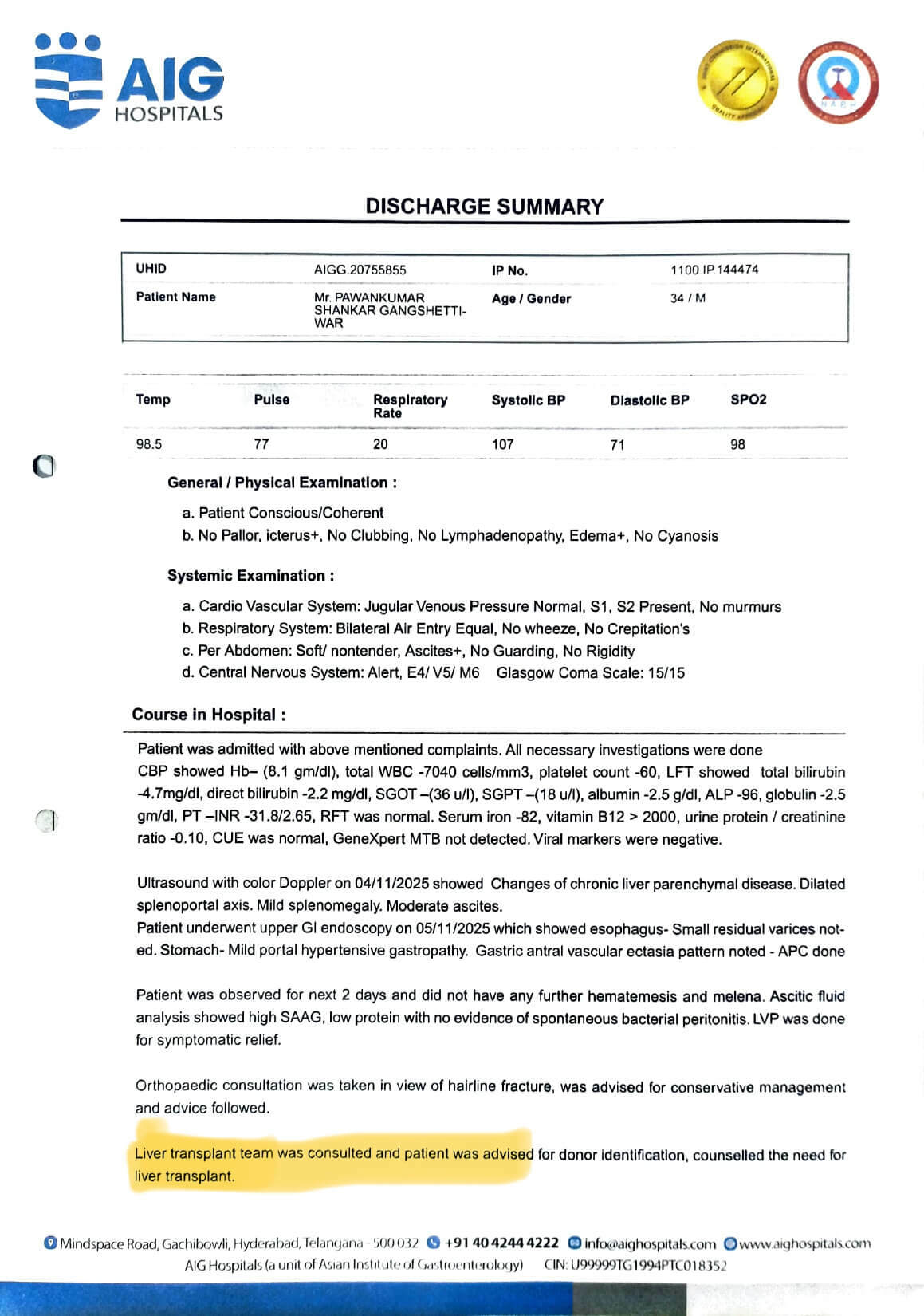 ಈ ಸ್ಥಿತಿಯು ಹೊಟ್ಟೆಯಲ್ಲಿ ದ್ರವದ ಶೇಖರಣೆ, ತೀವ್ರ ಆಯಾಸ, ತೂಕ ನಷ್ಟ ಮತ್ತು ಆಂತರಿಕ ರಕ್ತಸ್ರಾವ ಸೇರಿದಂತೆ ತೀವ್ರ ತೊಡಕುಗಳನ್ನು ತಂದಿದೆ. ಹೈದರಾಬಾದ್ನ ಎಐಜಿ ಆಸ್ಪತ್ರೆಗಳ ವೈದ್ಯರು ತಕ್ಷಣದ ಮತ್ತು ಜೀವ ಉಳಿಸುವ ಯಕೃತ್ತಿನ ಕಸಿಗೆ ಸಲಹೆ ನೀಡಿದರು.