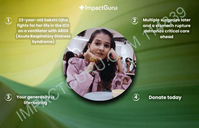 23 वर्षीय साक्षी ओझा कई सर्जरी और पेट फटने के बाद ARDS से जूझ रही हैं। वह आईसीयू में वेंटिलेटर पर हैं और सांस लेने के लिए संघर्ष कर रही हैं। आपका सहयोग उन्हें जीवित रहने और अपने परिवार के पास लौटने का मौका दे सकता है। ImpactGuru पर दान करें।