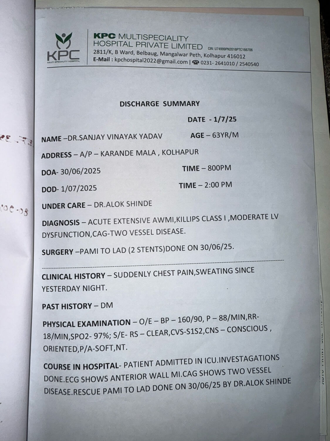 30 जून की सुबह, मेरे पिता को अचानक तेज़ सीने में दर्द हुआ। हम उन्हें तुरंत अस्पताल ले गए और डॉक्टरों ने बताया कि उन्हेभयंकर हार्ट अटैक आया है। यह विडंबना है कि मेरे पिता स्वयं एक डॉक्टर हैं — एक जनरल फिजीशियन (BMS) जिन्होंने अपना पूरा जीवन लोगों की निःस्वार्थ सेवा में बिताया है, खासकर उन मरीज़ों की जो इलाज का खर्च नहीं उठा सकते थे।