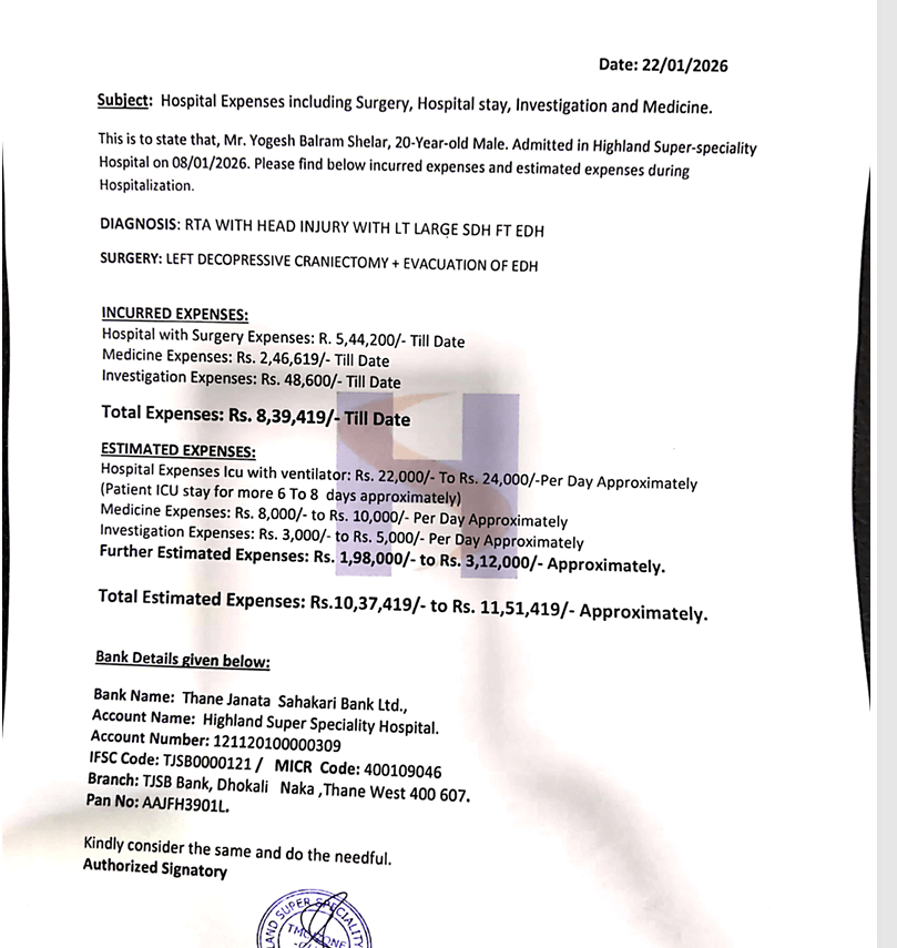 Yogesh is the pride of our family. I am a hardworking farmer with a very limited income. Watching our only son struggle for life has been devastating. We are emotionally shattered and financially overwhelmed by the rising costs of ICU care, surgery, medicines, and repeated scans.