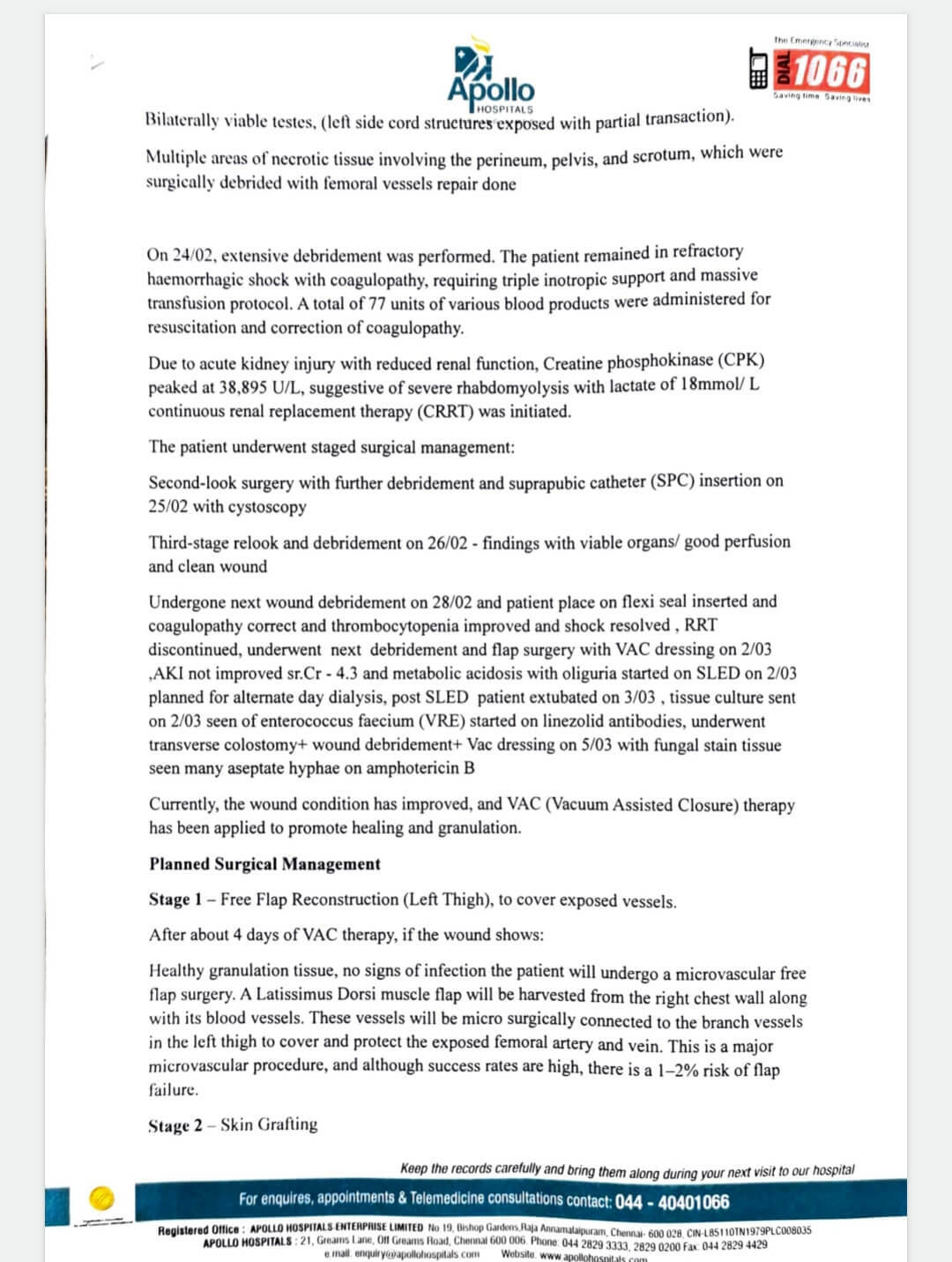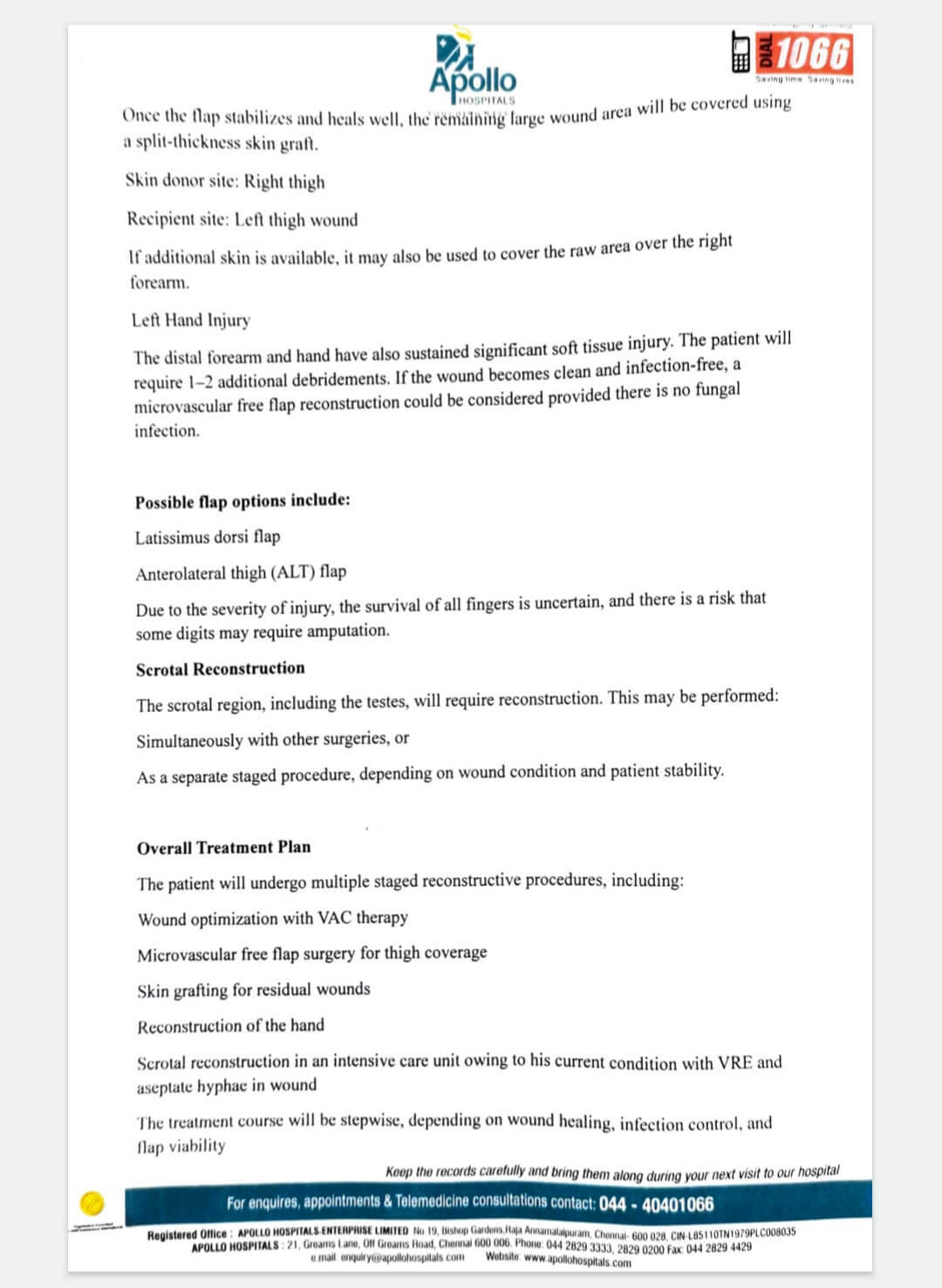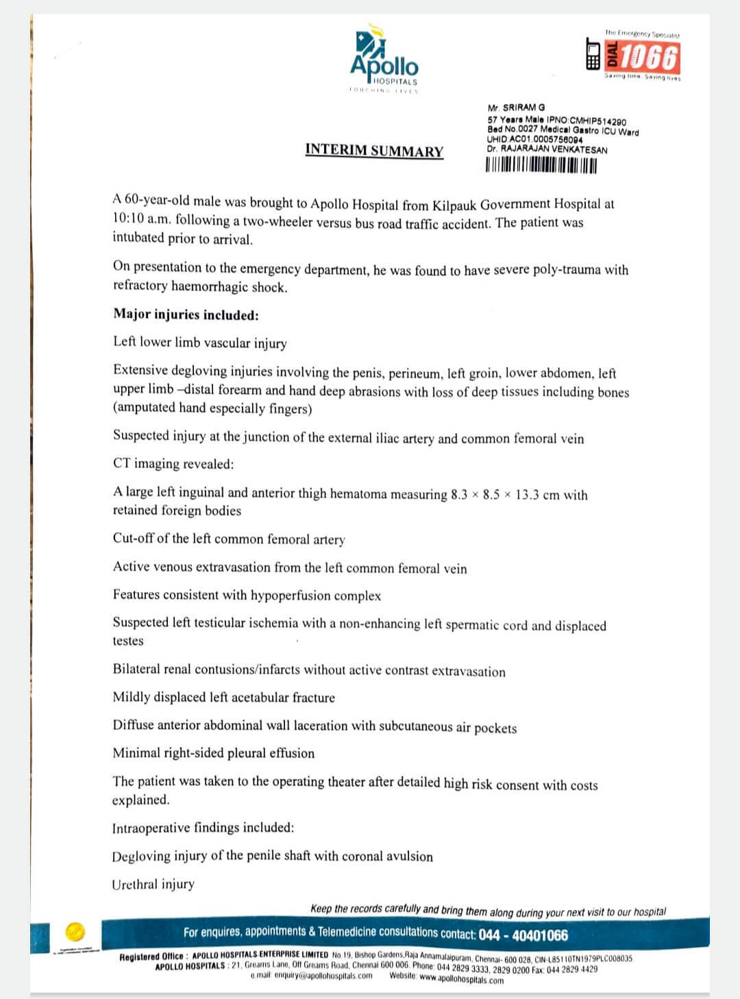 The medical diagnosis is "severe polytrauma with refractory hemorrhagic shock." My father’s injuries are extensive, affecting his pelvis, groin, lower abdomen, and limbs. His left hand, in particular, has suffered critical damage to the arteries and veins. He is currently facing a long and agonising road to recovery involving multiple complex surgeries to reconstruct his left arm and leg. The stakes are unimaginably high—if these procedures fail, he faces the possibility of amputation. Our entire family is devastated, watching the man who was once our strength now fighting for his very survival.