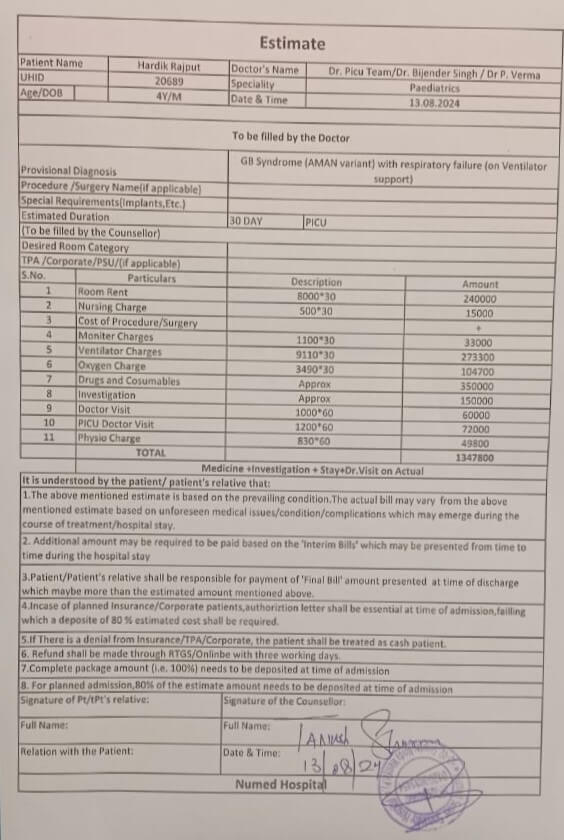 The doctors at Numed Hospital have recommended that Hardik stay in the PICU for at least 30 more days, with ongoing ventilator support.