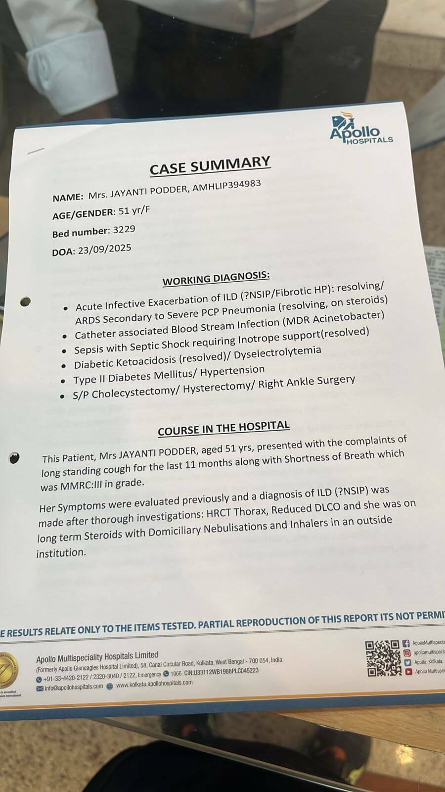 - Jayanti, 54, is fighting severe interstitial lung disease in ICU at Apollo Kolkata, where she’s on a ventilator doing her breathing for her.