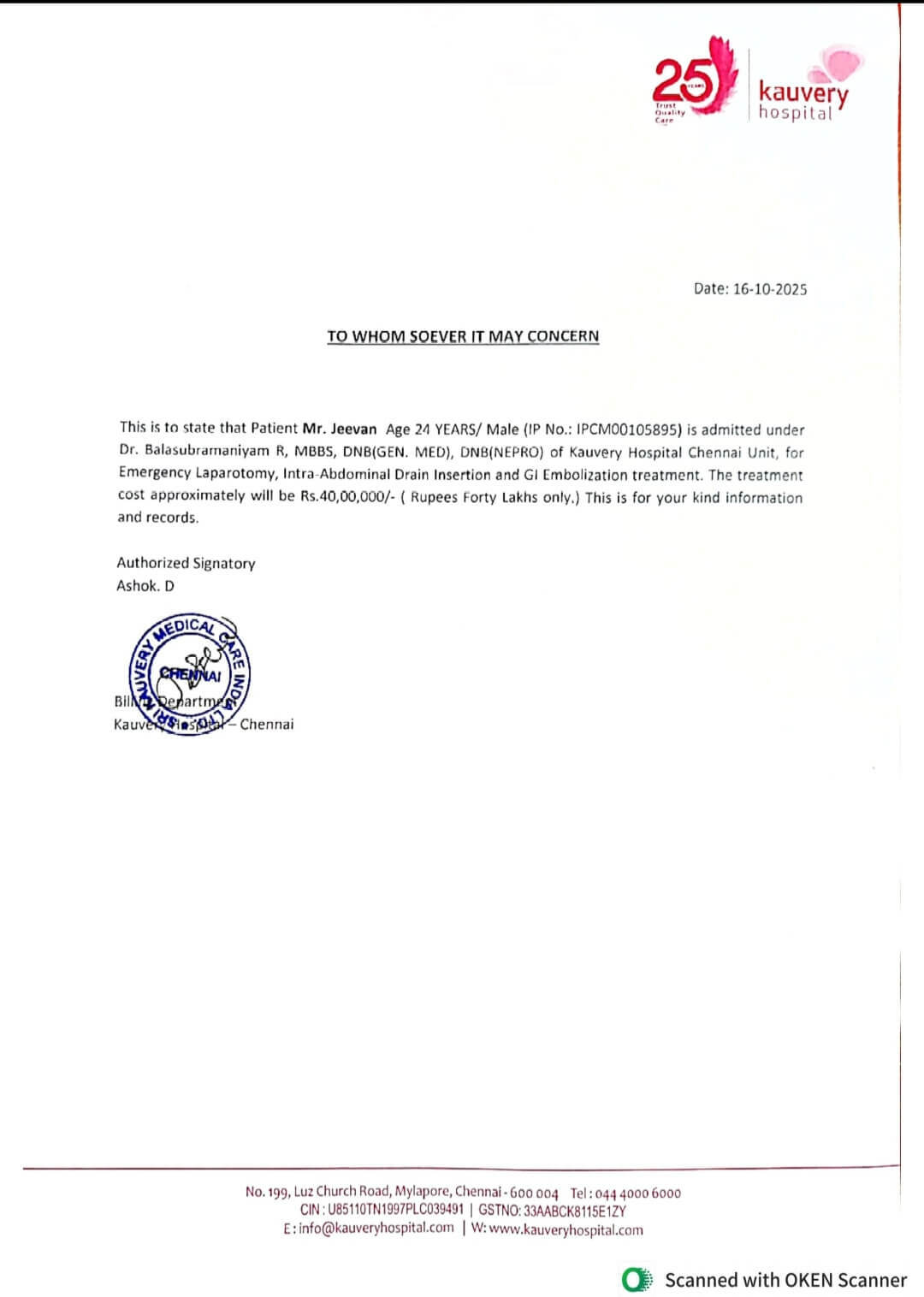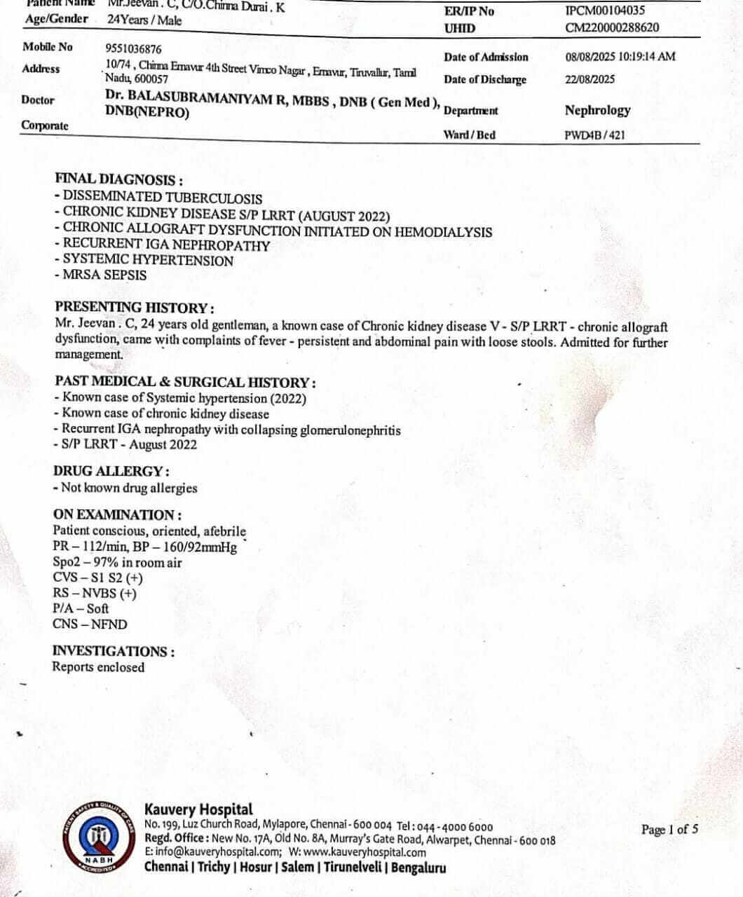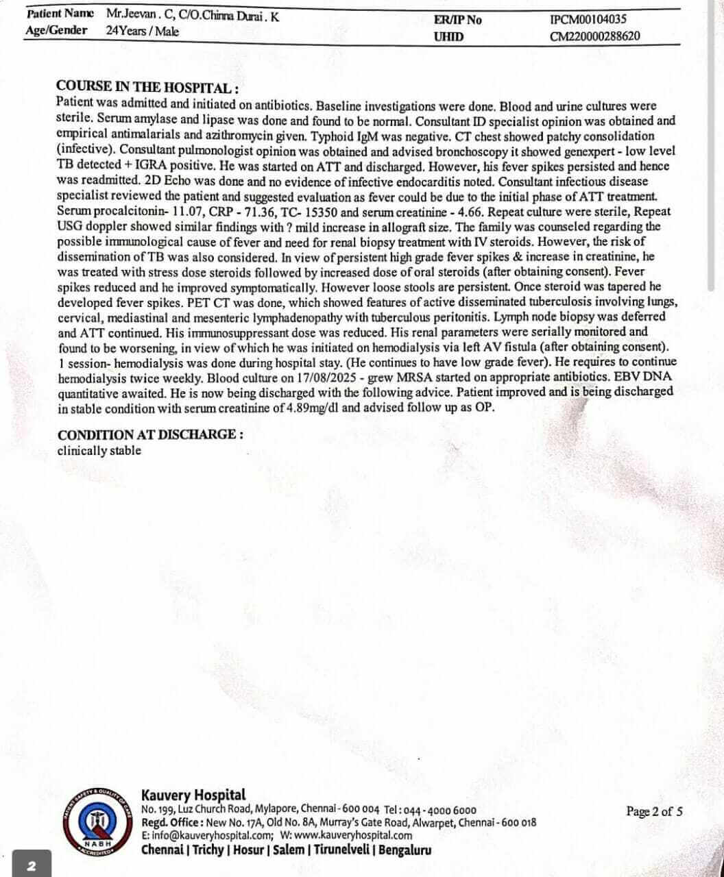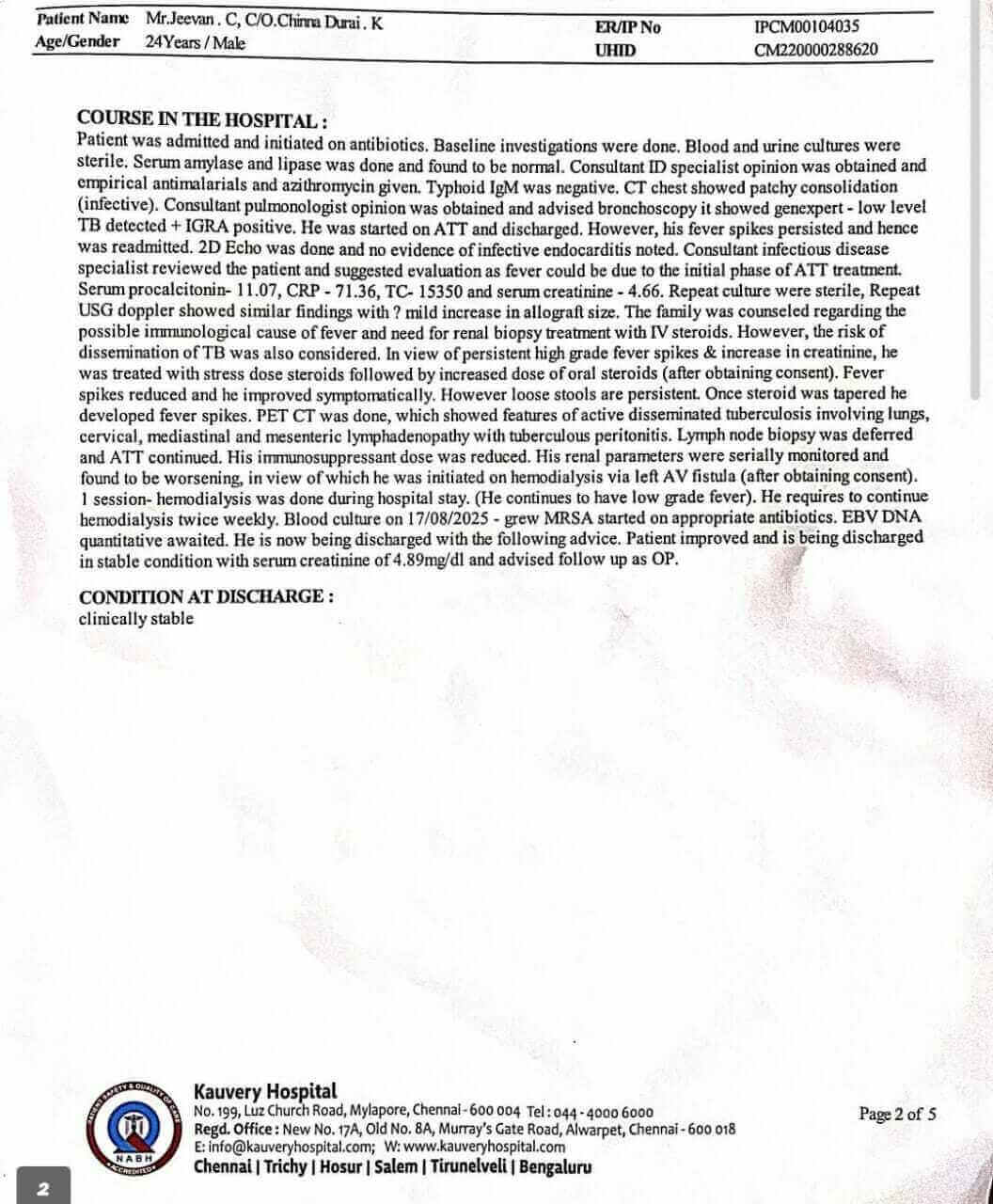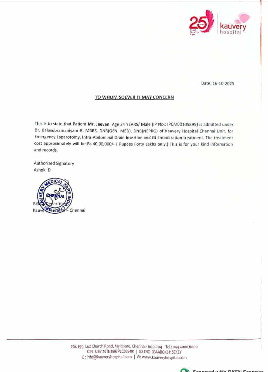 My name is Virginlaura AJ, and I am urgently raising funds for my son, Jeevan C, who is undergoing treatment for a kidney transplant at Kauvery Hospital, Chennai. He was admitted on 10th September 2025, and the total cost of his treatment is ₹30,00,000.