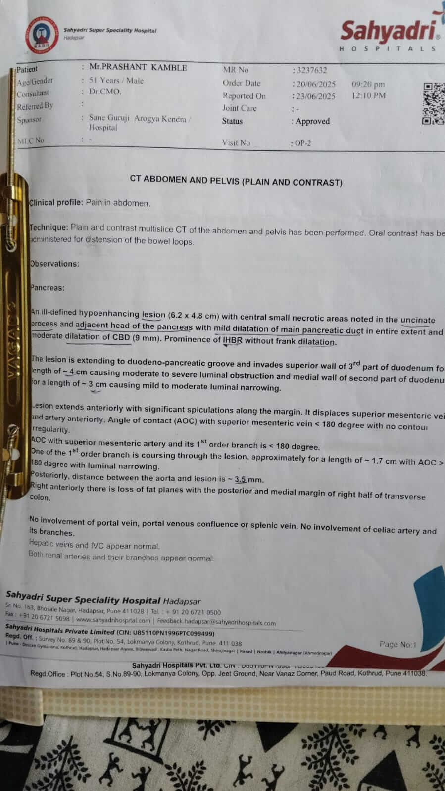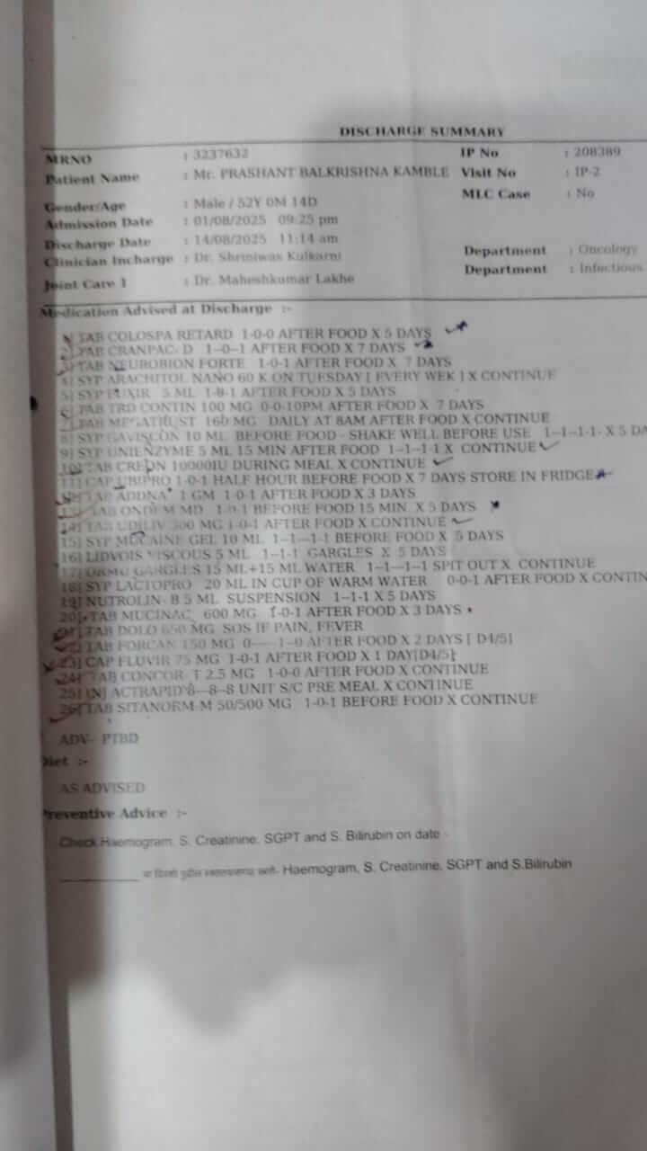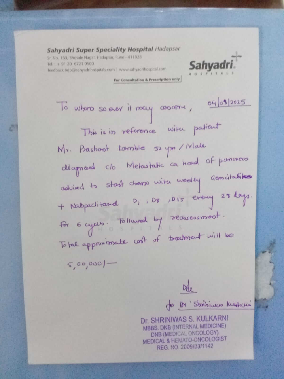 Prashant was diagnosed with pancreatic cancer in June 2025. He is currently at home and visiting the hospital for chemotherapy. Out of 6 planned cycles, 4 have been completed. The treatment schedule is on day 1, day 8, and day 15 of every 28-day cycle. His condition is stable at present, and further treatment will be decided after chemotherapy is completed.