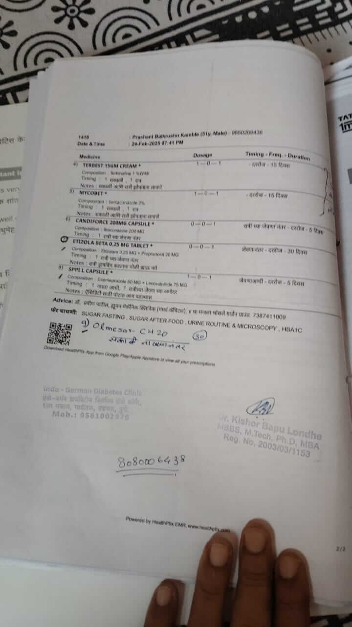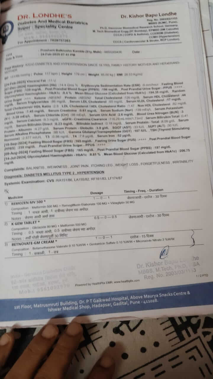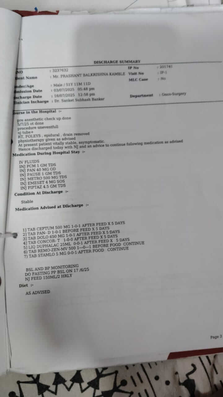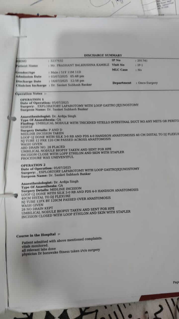 Prashant was diagnosed with pancreatic cancer in June 2025. He is currently at home and visiting the hospital for chemotherapy. Out of 6 planned cycles, 4 have been completed. The treatment schedule is on day 1, day 8, and day 15 of every 28-day cycle. His condition is stable at present, and further treatment will be decided after chemotherapy is completed.