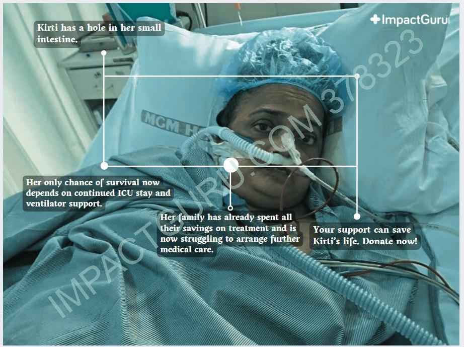 She had to undergo emergency intestinal surgery. While the operation was successful, Kirti now requires an extended stay in the ICU. She is currently on a ventilator, as her lungs have collapsed.