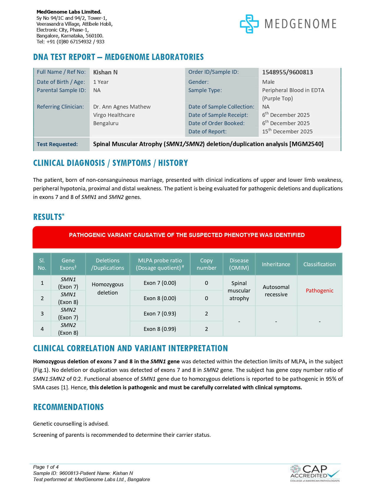 ಕಿಶನ್ಗೆ SMA ಟೈಪ್ 2 ದೃಢಪಟ್ಟಿದ್ದು, ಅವನ ಬೆಳವಣಿಗೆಯೊಂದಿಗೆ ಸ್ನಾಯು ಶಕ್ತಿಯನ್ನು ಕ್ರಮೇಣ ಕಳೆದುಕೊಳ್ಳುವಂತೆ ಮಾಡುತ್ತದೆ.