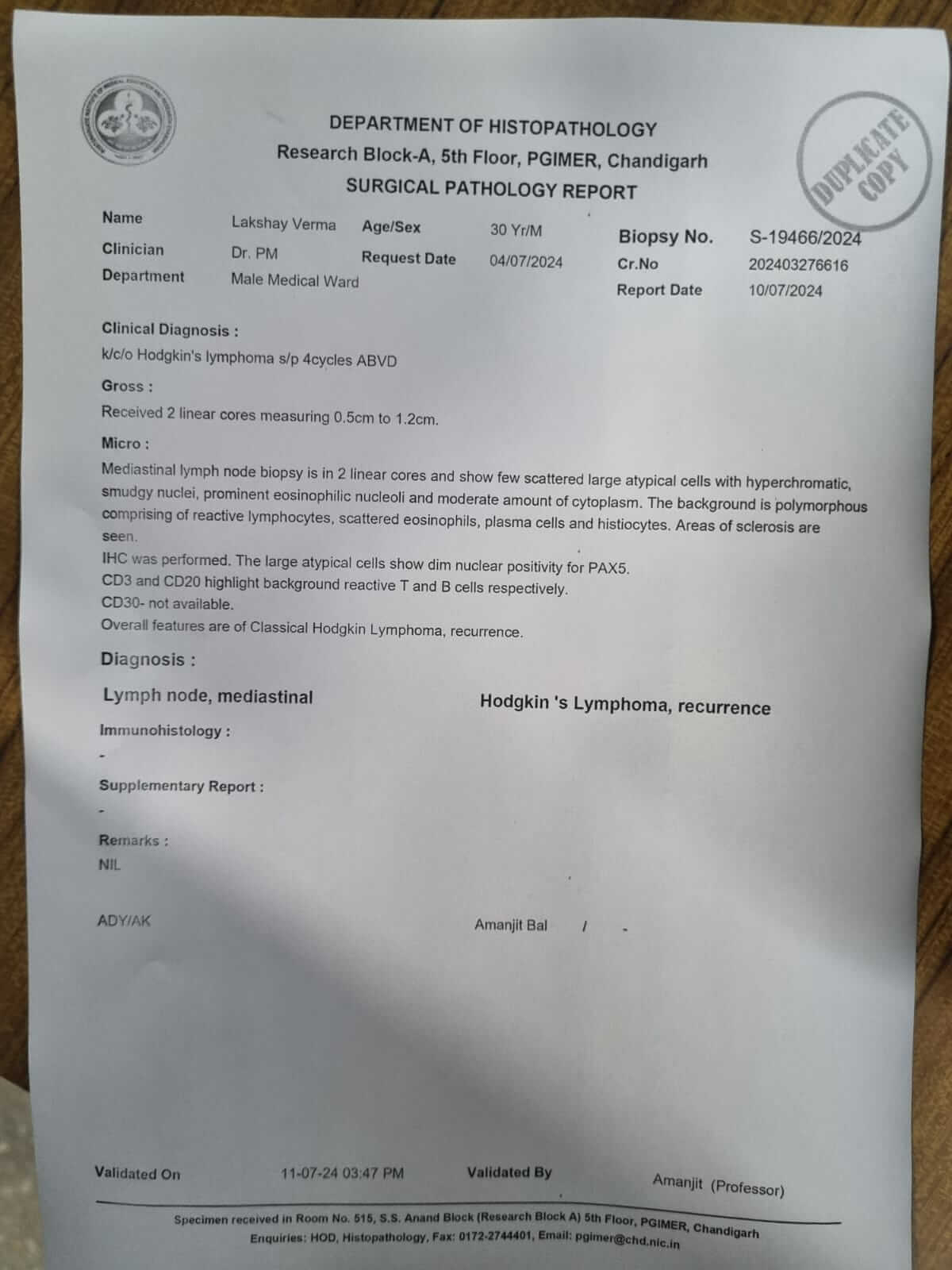 Currently, Lakshay is at Ivy Hospital, Mohali where he is undergoing immunotherapy. As of now, Lakshay has undergone 6 cycles of immunotherapy. Doctors have planned for a bone marrow transplant and follow-up care, which requires lakhs of rupees.