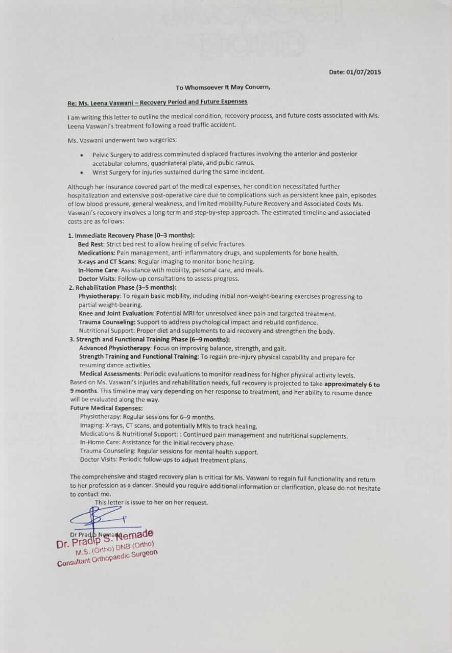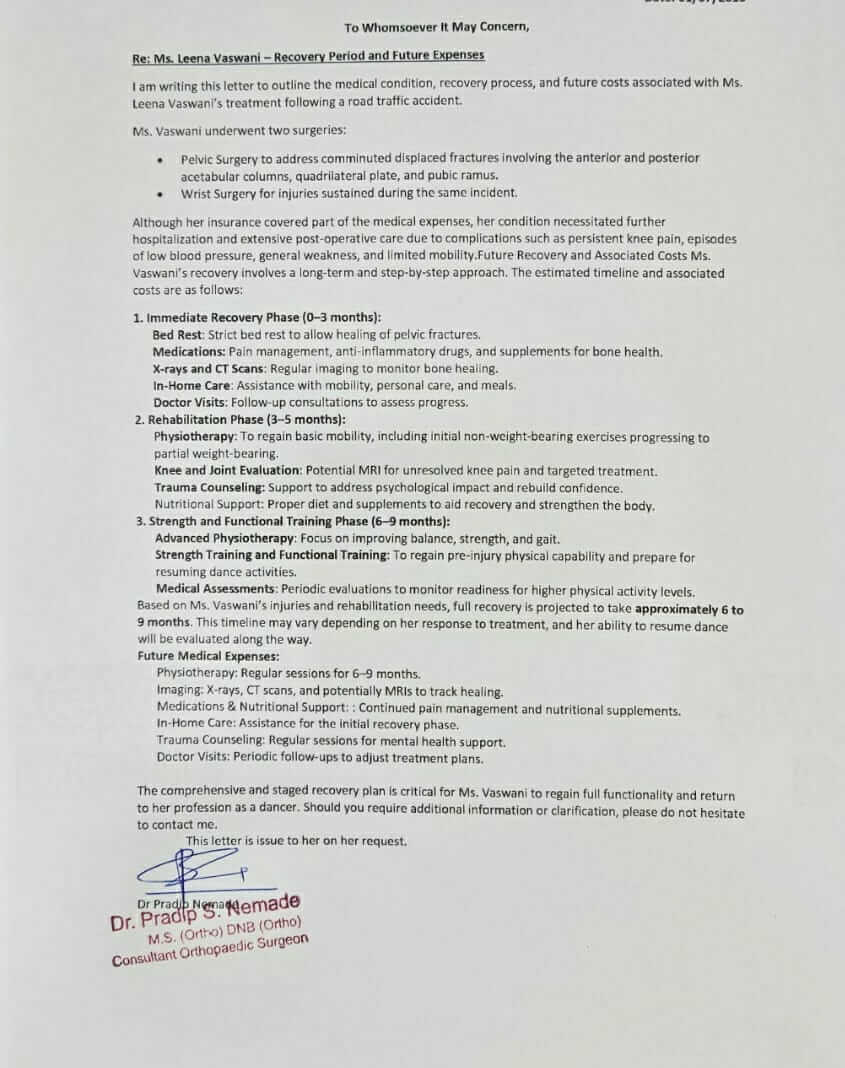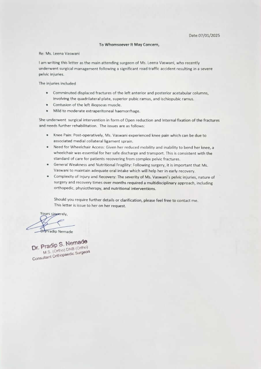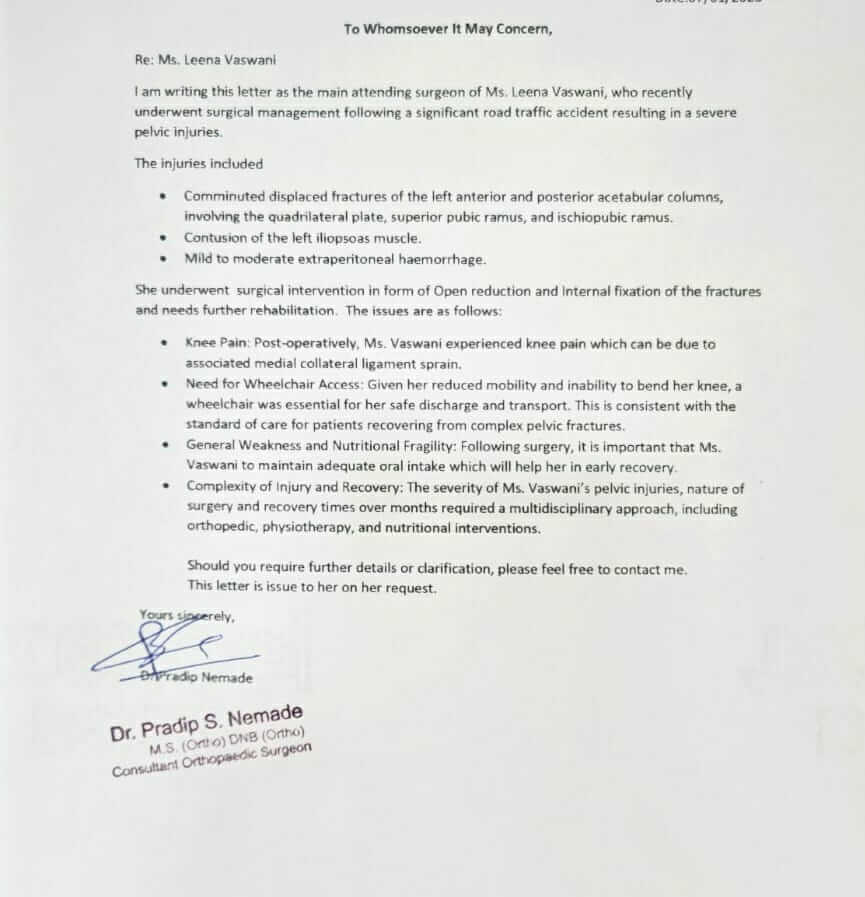 वर्तमान में: 52 वर्षीय लीना को घुटने, पेल्विक हड्डी और कलाई में गंभीर फ्रैक्चर और चोटों के कारण 6 महीने तक व्यापक फिजियोथेरेपी की आवश्यकता है। ठीक होने में लगभग 7 से 8 महीने लगेंगे और वह अभी भी खड़ी होने में असमर्थ है।