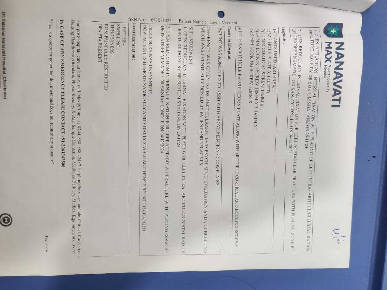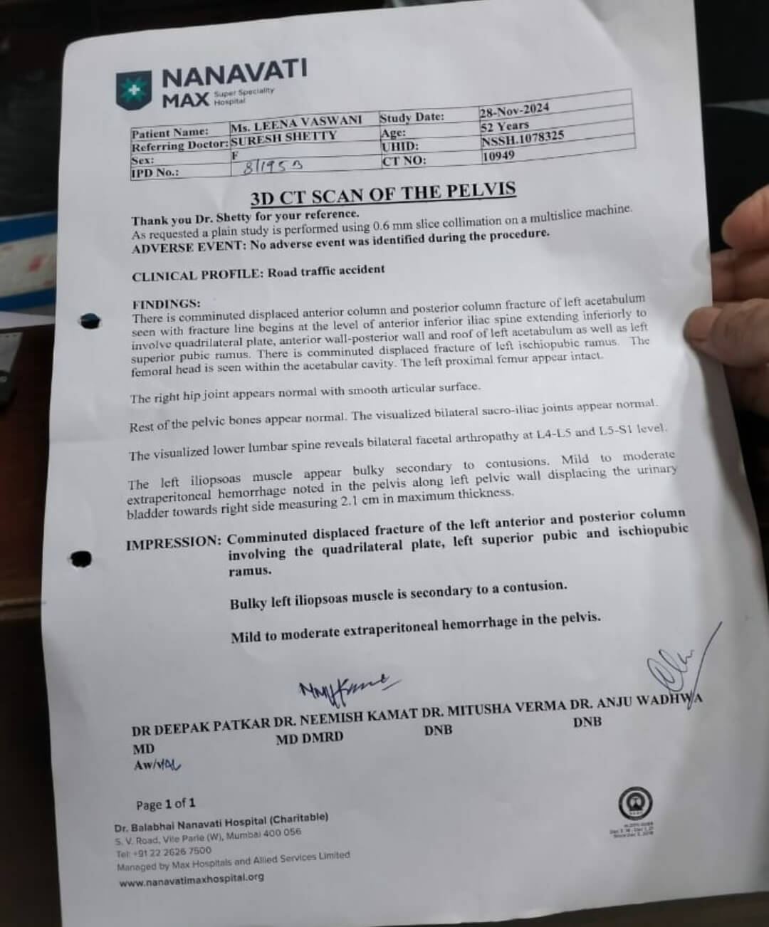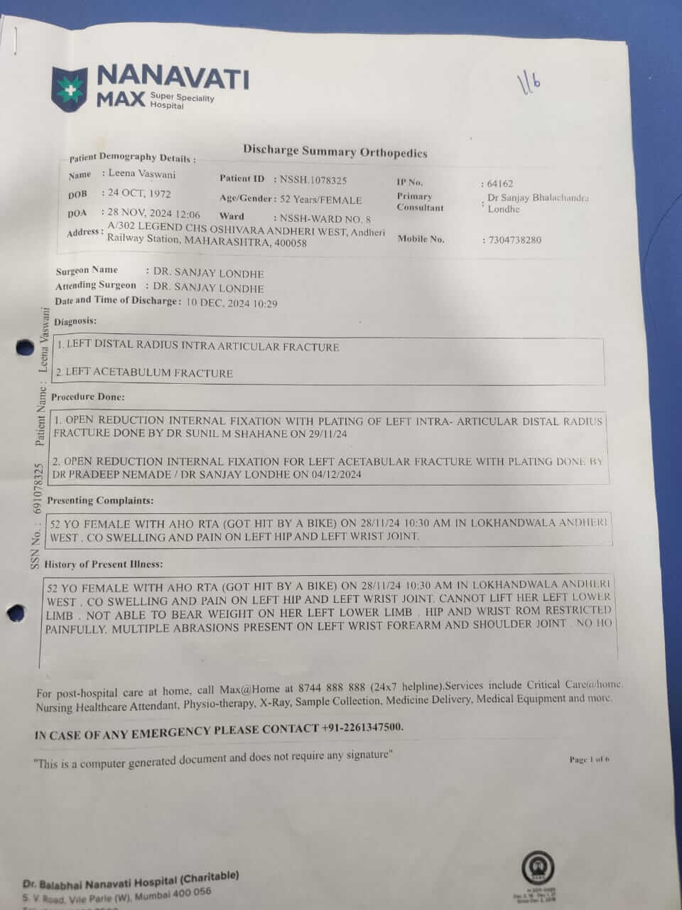 वर्तमान में: 52 वर्षीय लीना को घुटने, पेल्विक हड्डी और कलाई में गंभीर फ्रैक्चर और चोटों के कारण 6 महीने तक व्यापक फिजियोथेरेपी की आवश्यकता है। ठीक होने में लगभग 7 से 8 महीने लगेंगे और वह अभी भी खड़ी होने में असमर्थ है।