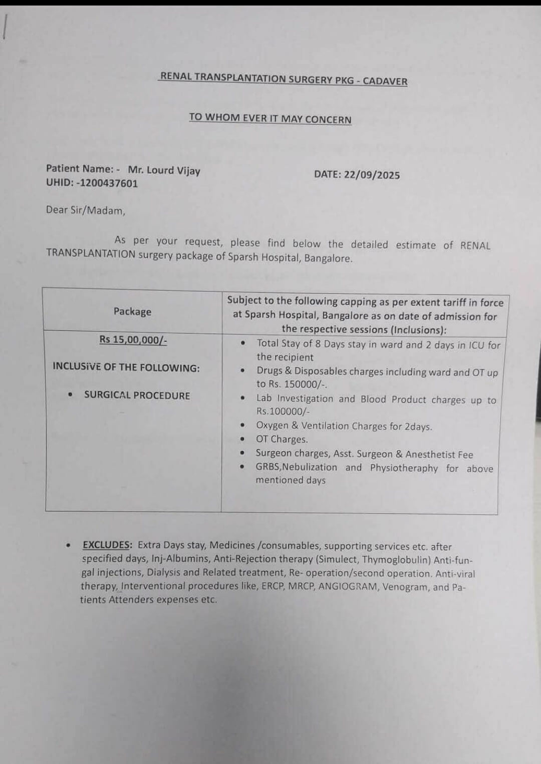 ನಾನು ಜೋಸೆಫ್ - ಲೌರ್ಡ್ ಪ್ರೇಮ್ ವಿಜಯ್ ಅವರ ತಂದೆ. ನನ್ನ ಮಗ ಎರಡನೇ ಮೂತ್ರಪಿಂಡ ಕಸಿ ನಂತರ ಐಸಿಯುನಲ್ಲಿ ಜೀವಕ್ಕಾಗಿ ಹೋರಾಡುತ್ತಿದ್ದಾನೆ. ಅವನ ಸ್ಥಿತಿ ಗಂಭೀರವಾಗಿದೆ ಮತ್ತು ತಕ್ಷಣದ ವೈದ್ಯಕೀಯ ನೆರವು ಮತ್ತು ಕಸಿ ನಂತರದ ಚಿಕಿತ್ಸೆ ಇಲ್ಲದೆ, ನಾನು ಅವನನ್ನು ಕಳೆದುಕೊಳ್ಳಬಹುದು.