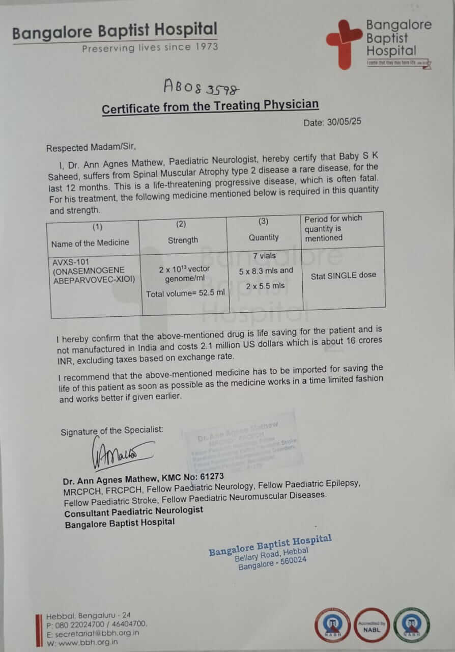 However, the cost of this therapy is an overwhelming INR 9 crore. Though extremely expensive, Zolgensma is not just a treatment for Saheed; it is his only real hope for complete recovery and a future where he can sit, stand, and live like other children his age.