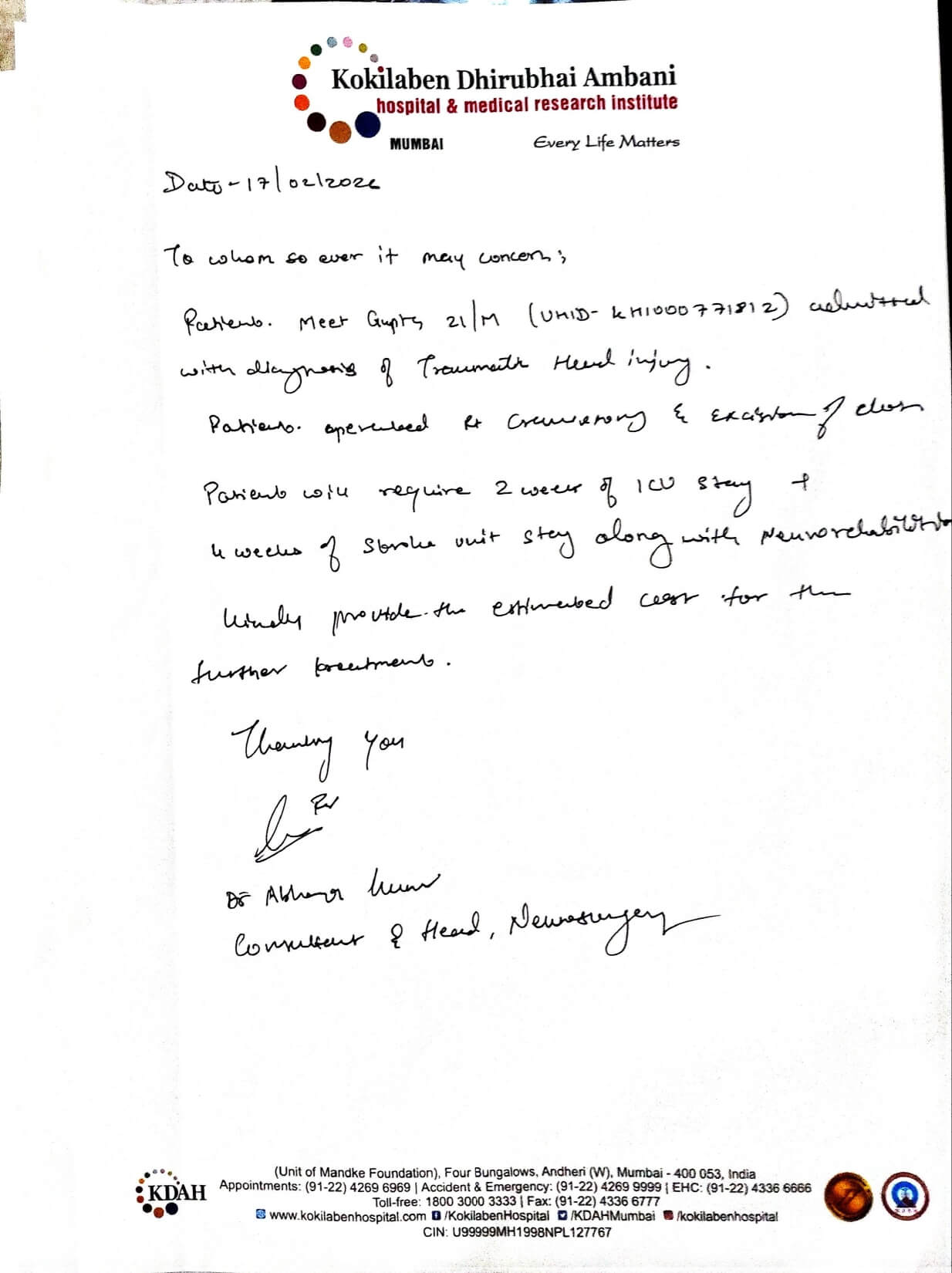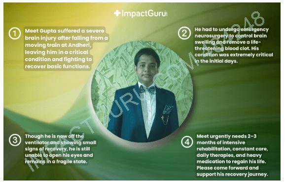 He depends on continuous close medical care to stay stable. The cost of his treatment and ongoing recovery has already run into lakhs, and despite our family’s best efforts, we are still falling short of the funds needed to continue his care and prevent his condition from worsening further.
