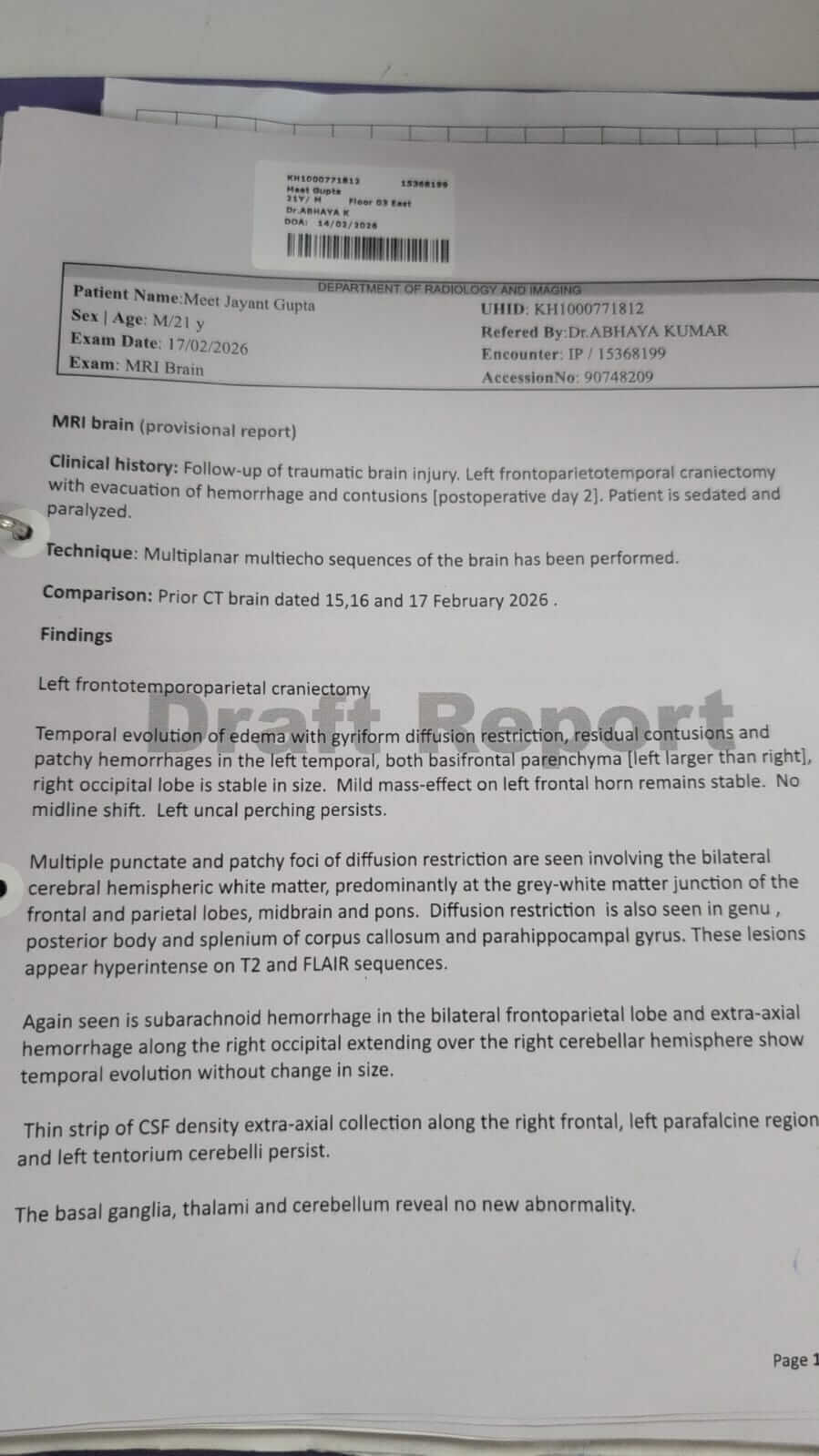 I still can’t process how one normal day turned into this. My brother Meet was just coming back home from college, and then one phone call changed everything. They said he fell from a moving train at Andheri. When I saw him in the hospital, he didn’t look like the same person. His head was badly injured, and doctors had to rush him for brain surgery to control the swelling and remove a blood clot.