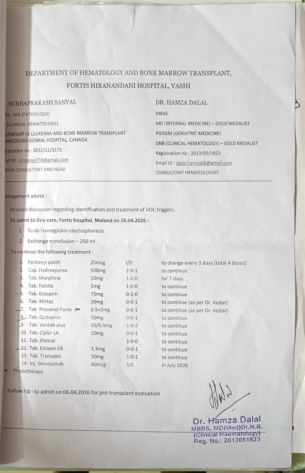 मैं लगातार चिकित्सीय देखभाल में हूँ, और मेरी हालत के लिए बोन मैरो ट्रांसप्लांट और नियमित रक्त संक्रमण अत्यंत जरूरी हैं। वर्षों तक इलाज और अस्पताल में कई बार भर्ती होने के बावजूद, यह बीमारी मेरी सेहत और रोजमर्रा की जिंदगी पर गहरा असर डालती रही है।