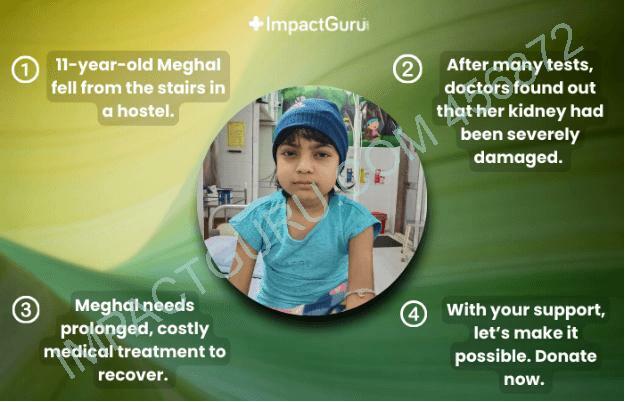 Meghal has been receiving treatment at Aalok Orthocare, Vidyavihar Colony, Ahmedabad, Gujarat. Doctors are trying everything in their power to save Meghal’s kidney, but she needs round-the-clock monitoring in the hospital with continuous doctor support.