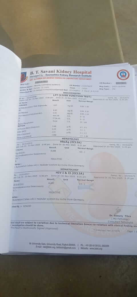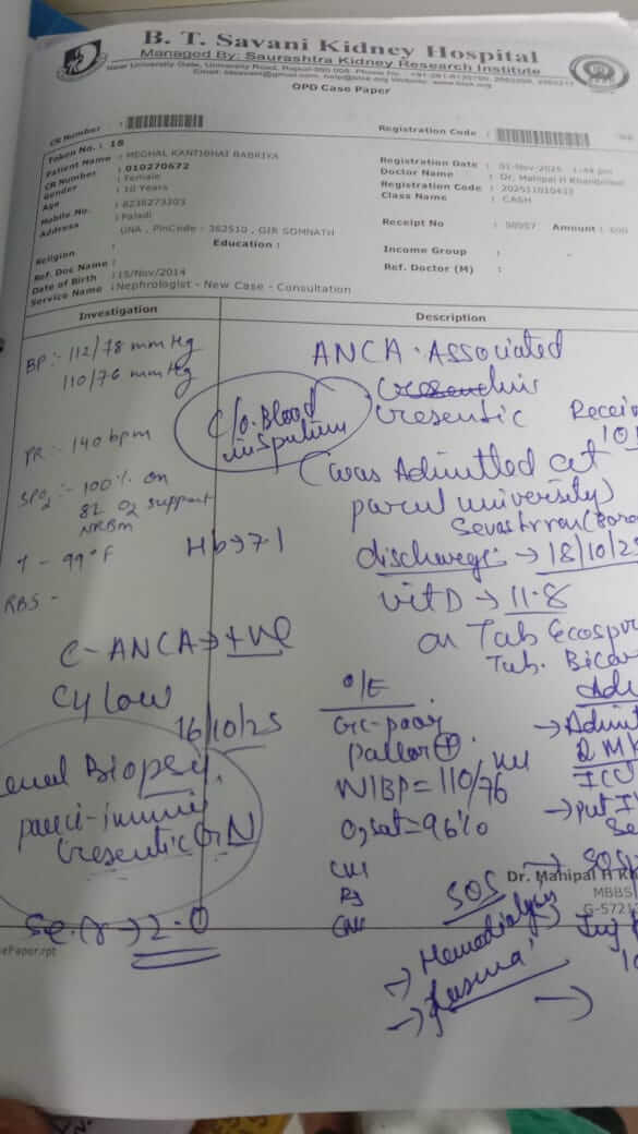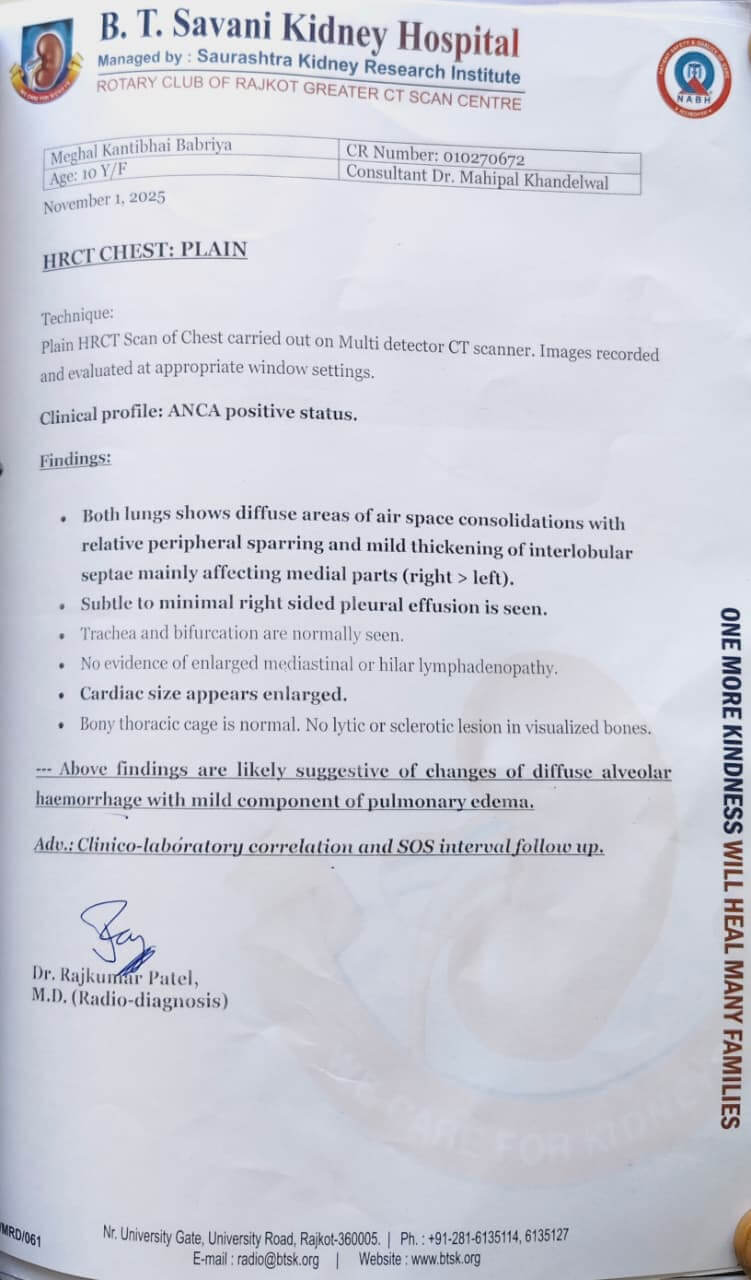 However, a few days later, Meghal started noticing blood in her urine, and her health began to worsen rapidly. Her concerned parents took her to many hospitals in Baroda and Rajkot, where, after several tests, doctors confirmed that Meghal had suffered from severe kidney damage.