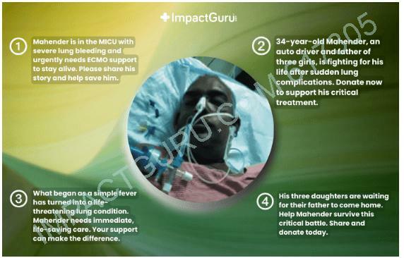 నా భర్త మహేందర్ వయసు కేవలం 34 సంవత్సరాలు. ఆయన మమ్మల్ని, నన్ను, మా ముగ్గురు చిన్న కూతుళ్లను, అతని తల్లిదండ్రులను చూసుకోవడానికి ప్రతిరోజూ ఆటో నడుపుతారు. కొన్ని రోజుల క్రితం, జలుబు, జ్వరం మాత్రమే వచ్చాయి. మేము అతనికి మందులు ఇచ్చి, ఒకటి లేదా రెండు రోజుల్లో అతను బాగానే ఉంటాడని అనుకున్నాము. కానీ అతని దగ్గు తీవ్రమైంది, ఆపై అంతా చాలా త్వరగా జరిగింది. అతని ఊపిరితిత్తులలో తీవ్రమైన రక్తస్రావం జరుగుతుందని వైద్యులు చెప్పారు.