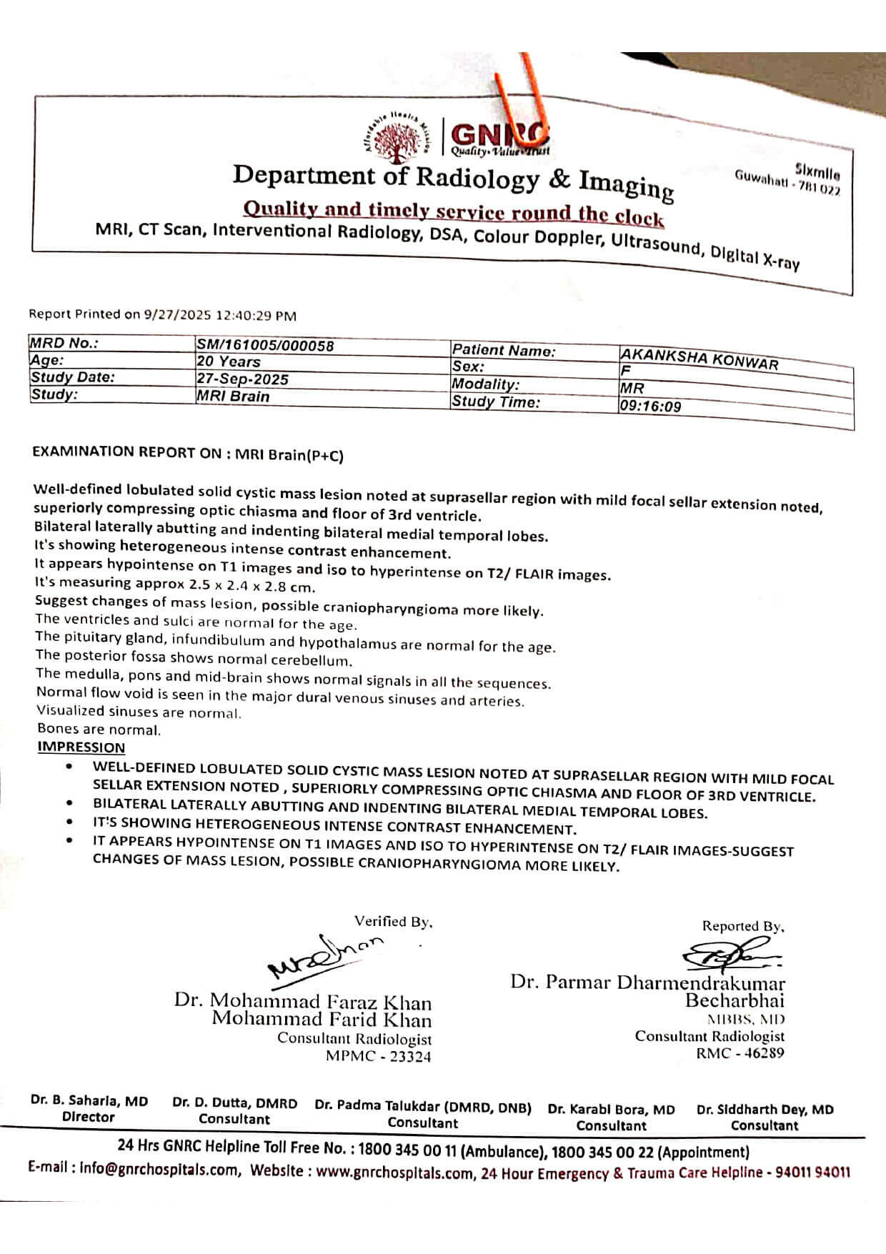 My name is Dr Purnananda, and I am reaching out with a request to help my daughter, Ms Akanksha Konwar, who has been diagnosed with a brain tumour (Craniopharyngioma). This condition has put her life at serious risk, and doctors have urgently advised brain surgery as the next step in her treatment.