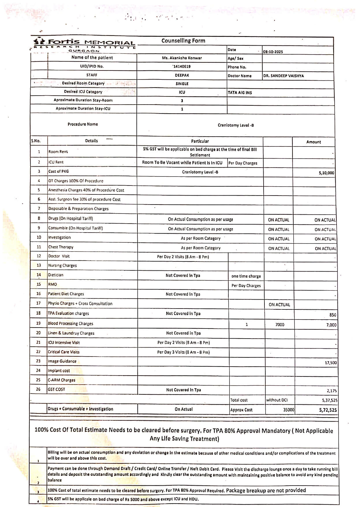 Akanksha is currently admitted to Fortis Memorial Hospital, Gurgaon, under close medical supervision. She is scheduled to undergo neuronavigation-guided excision of the tumour on 15th October 2025. The surgery is crucial and cannot be delayed.