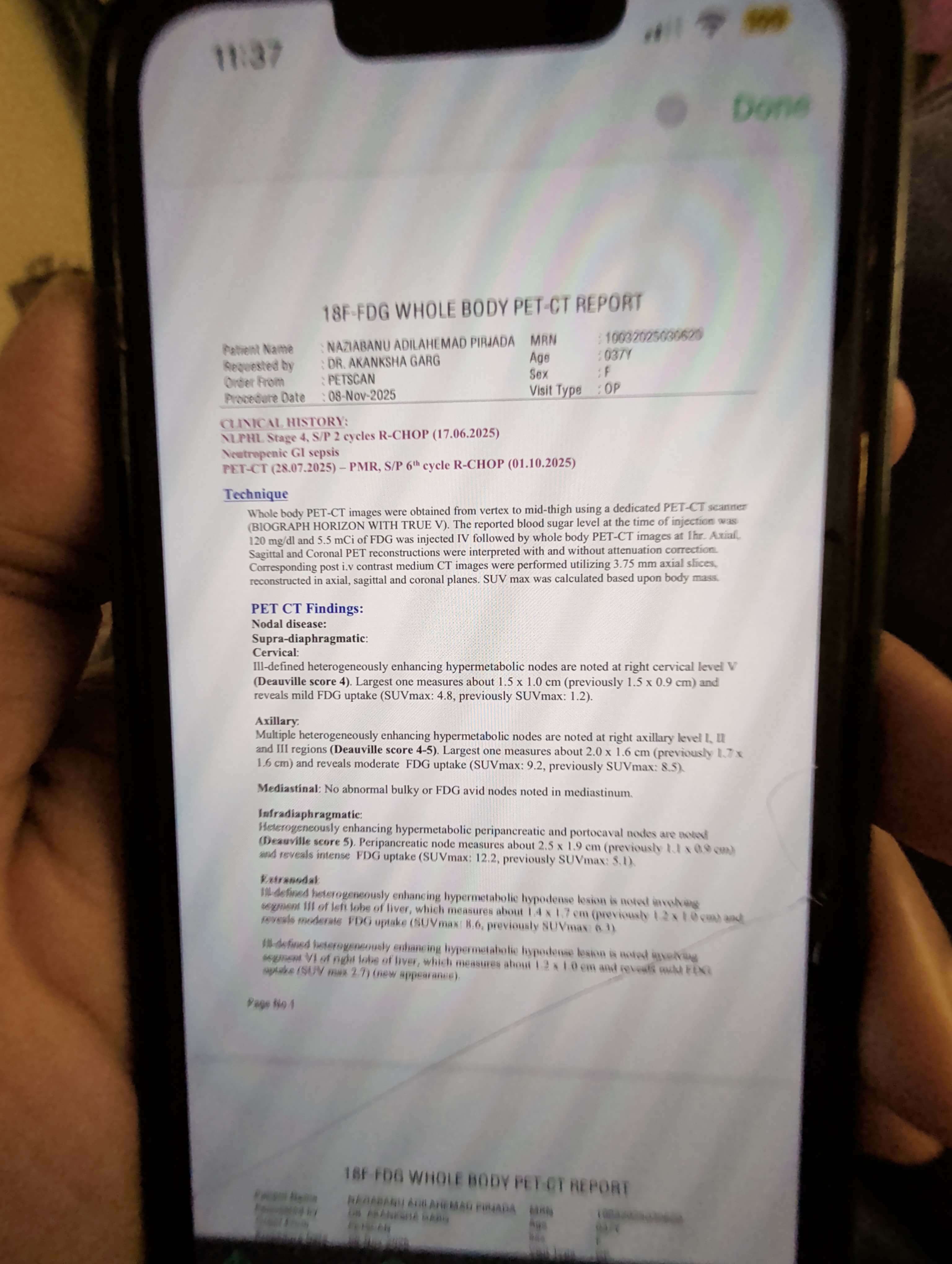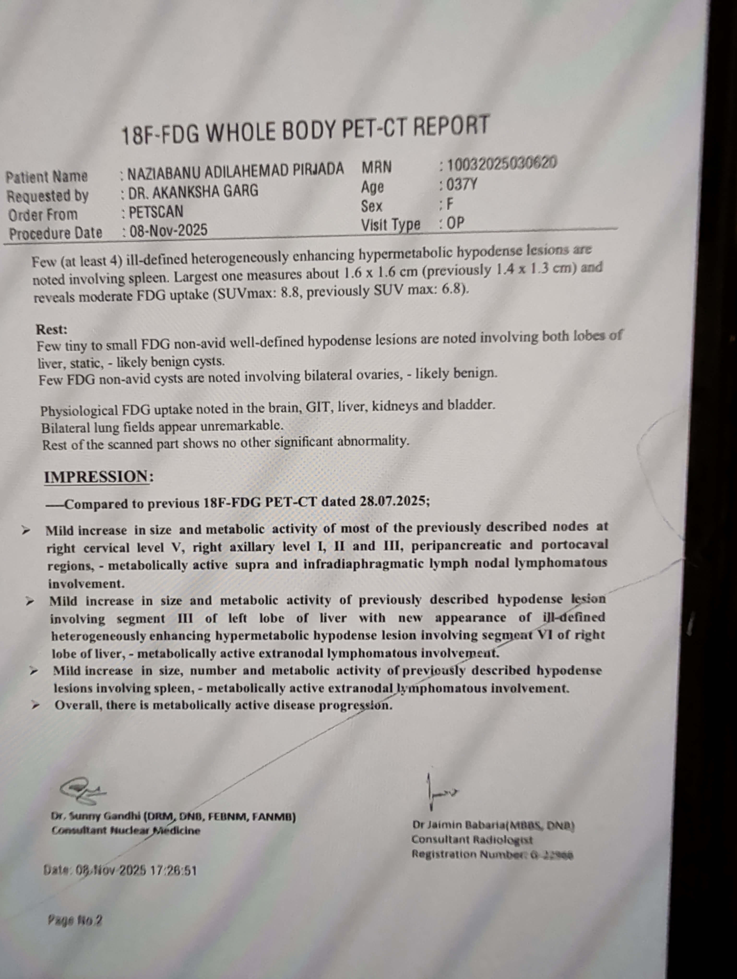 Hi, I am Ahmed, Naziabanu’s brother. Our lives changed forever in May when my sister was diagnosed with blood cancer – relapsed DLBCL (T-cell rich B-cell large lymphoma). Until then, we were living a simple, happy life. It started with knots and lumps under her arm and near her neck, followed by extreme weakness, dizziness, mouth ulcers, stomach pain, diarrhoea, and repeated infections due to very low immunity. She began treatment with R-CHOP chemotherapy, but it did not work. The cancer relapsed aggressively and is still active, with lymph nodes now involved near her liver and spleen. She is currently undergoing Polatuzumab-based salvage chemotherapy with Rituximab and Bendamustine, but her body is under severe strain. She weighs only around 38 kg, is constantly weak, in pain, and physically exhausted from both the disease and the harsh treatment.