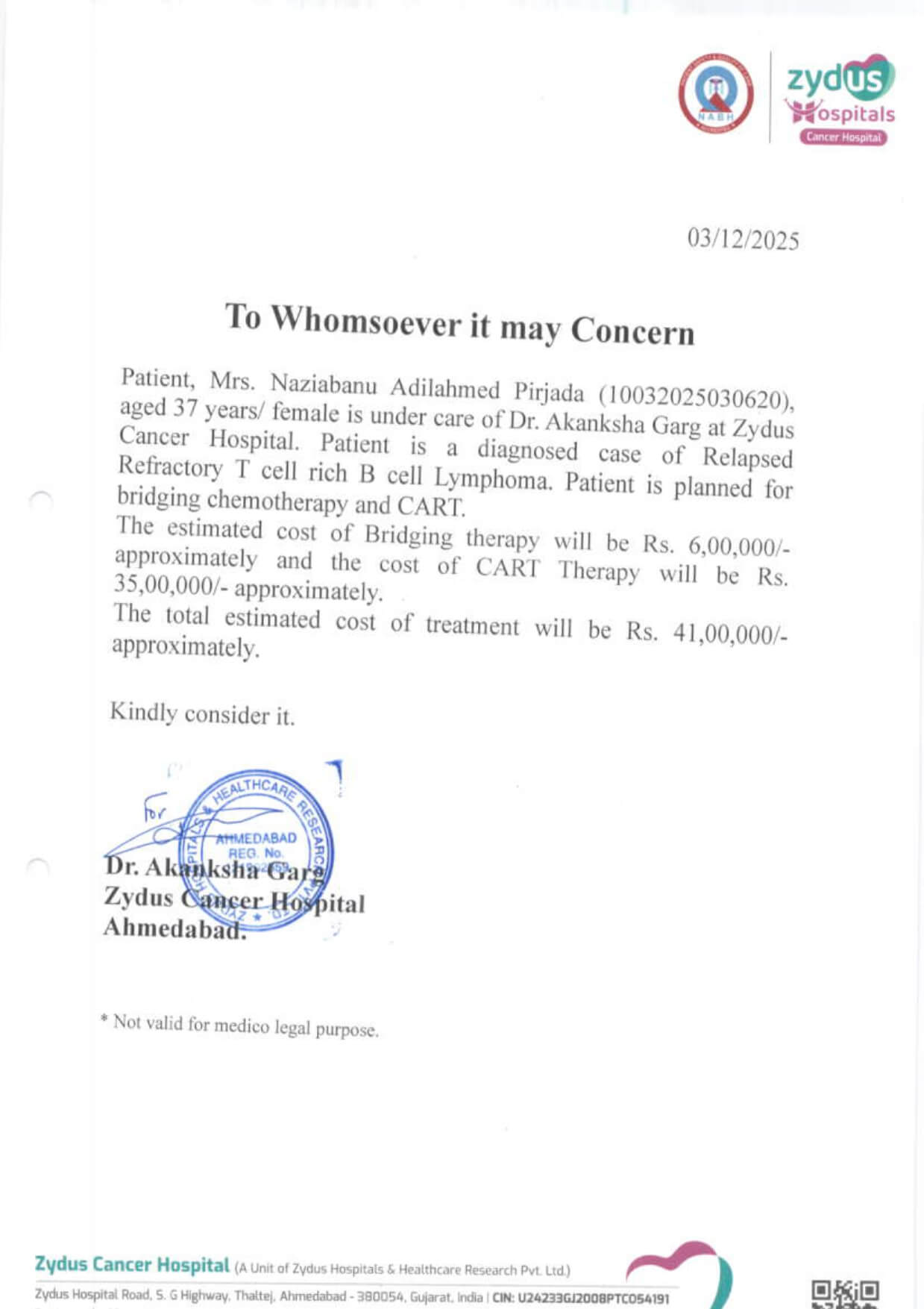 નમસ્તે, હું અહેમદ છું, નાઝિયાબાનુનો ભાઈ. મે મહિનામાં જ્યારે મારી બહેનને બ્લડ કેન્સર - રિલેપ્સ્ડ DLBCL (ટી-સેલ રિચ બી-સેલ લાર્જ લિમ્ફોમા) હોવાનું નિદાન થયું ત્યારે અમારું જીવન હંમેશ માટે બદલાઈ ગયું. ત્યાં સુધી, અમે એક સરળ, સુખી જીવન જીવી રહ્યા હતા. શરૂઆત તેના હાથ નીચે અને તેની ગરદન પાસે ગાંઠો અને ગઠ્ઠાઓથી થઈ, ત્યારબાદ ખૂબ જ નબળાઈ, ચક્કર, મોંમાં અલ્સર, પેટમાં દુખાવો, ઝાડા અને ખૂબ જ ઓછી રોગપ્રતિકારક શક્તિને કારણે વારંવાર ચેપ લાગ્યો. તેણે R-CHOP કીમોથેરાપીથી સારવાર શરૂ કરી, પરંતુ તે કામ ન કર્યું. કેન્સર ફરીથી આક્રમક રીતે ફરી વળ્યું અને હજુ પણ સક્રિય છે, તેના લીવર અને બરોળની નજીક લસિકા ગાંઠો સામેલ છે. તે હાલમાં રિટુક્સિમાબ અને બેન્ડામુસ્ટાઇન સાથે પોલાટુઝુમાબ આધારિત સેલ્વેજ કીમોથેરાપી કરાવી રહી છે, પરંતુ તેનું શરીર ભારે તાણ હેઠળ છે. તેનું વજન ફક્ત 38 કિલો છે, તે સતત નબળી, પીડામાં છે, અને રોગ અને કઠોર સારવાર બંનેથી શારીરિક રીતે થાકી ગઈ છે.