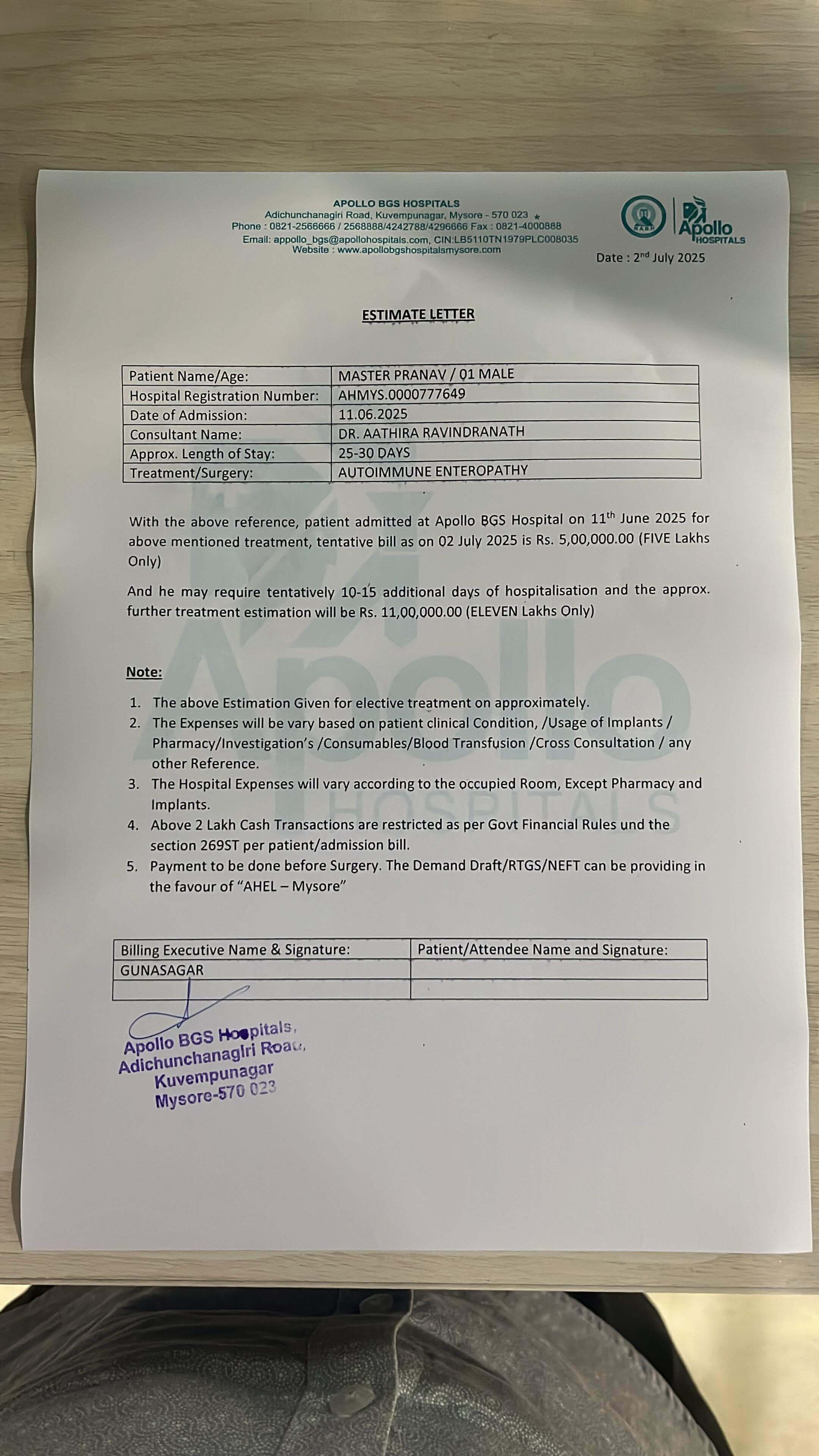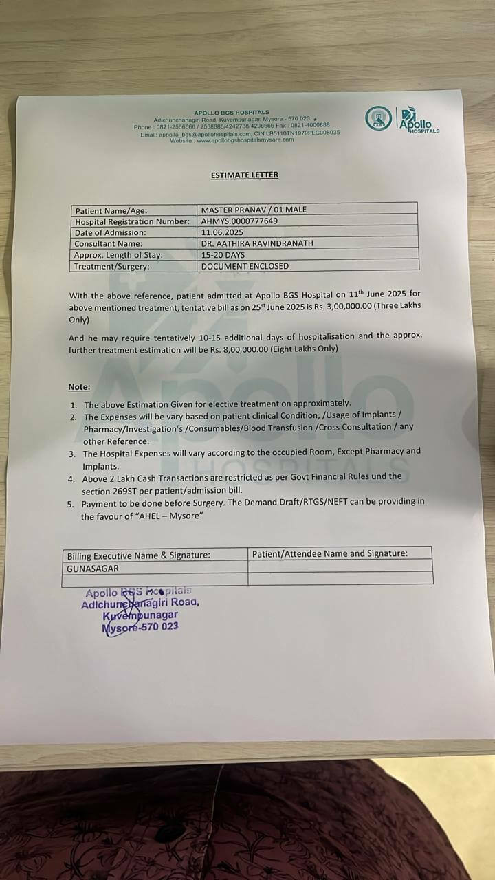“As a father, you imagine celebrating your child’s first words, first steps, and first birthday. Instead, I find myself sitting beside my one-year-old son, Pranav, inside Apollo Hospitals Enterprise Ltd, Mysuru, praying that he makes it to his next tomorrow.