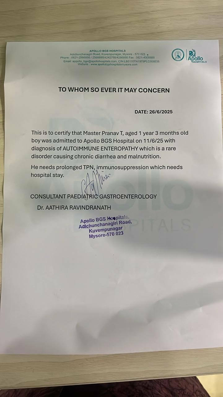 Pranav has been diagnosed with Autoimmune Enteropathy, a rare condition where his own immune system attacks his intestines. This means his body cannot absorb food like a normal child’s.