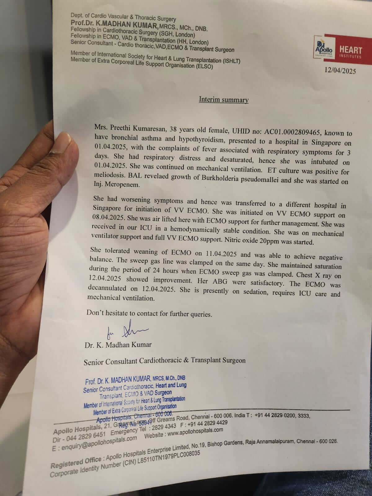 My name is K Kumaran, and I’m writing this with a heart full of pain and hope as my dear wife fights for her life. She is currently battling a severe lung infection at Singapore General Hospital, and the past few weeks have been the most difficult time our family has ever faced.