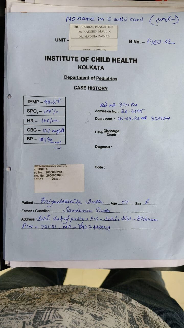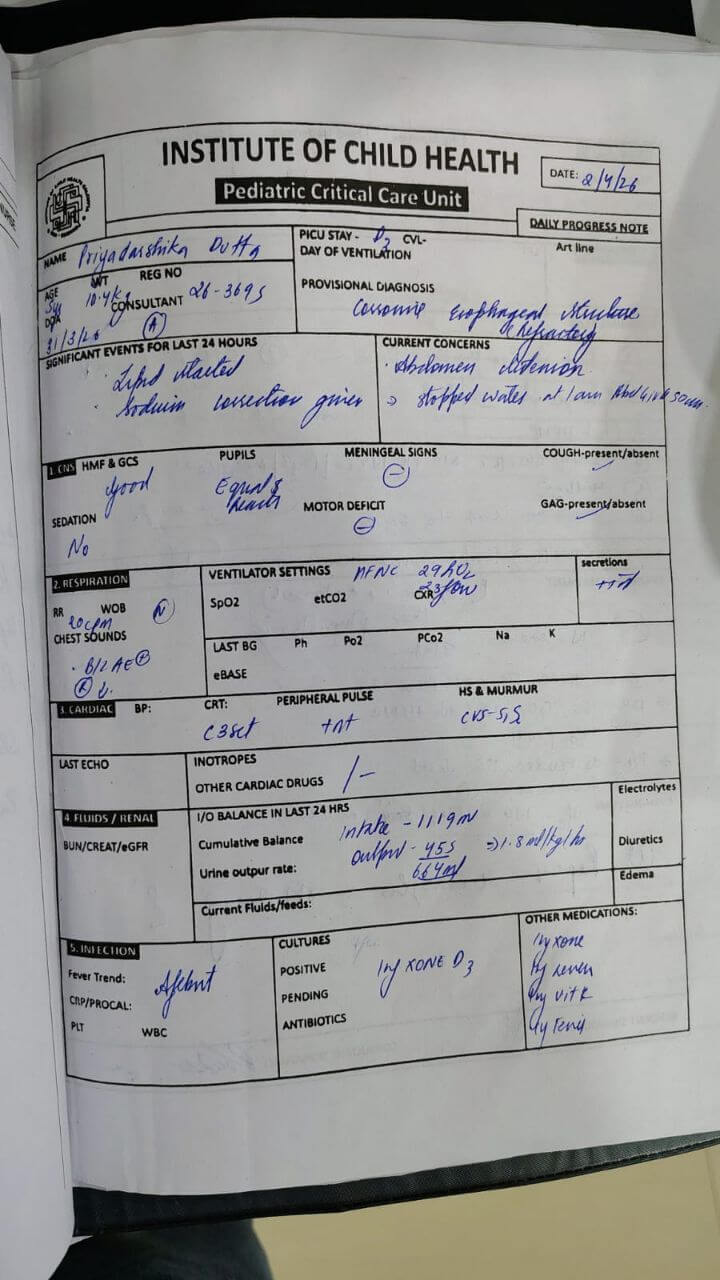My name is Shantanu Dutta, and I am reaching out with a heavy heart to seek your support for my beloved daughter, Priyadarshika Dutta, who is currently battling multiple serious health conditions, including Esophageal Stricture, Peritonitis, Respiratory Distress, and Aspiration Pneumonia. She is undergoing critical treatment at the Institute of Child Health, Kolkata, where doctors have advised urgent surgery along with continuous medications to save her life.